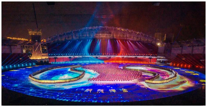 武漢軍運(yùn)會(huì)開(kāi)幕式的最大亮點(diǎn)是將舞臺(tái)搬到了室外。這個(gè)舞臺(tái)不僅是目前世界上面積最大的舞臺(tái),還是最大的全三維立體式舞臺(tái),同時(shí)也是使用投影技術(shù)面積最大的舞臺(tái)。楊笑陽(yáng)導(dǎo)演在這個(gè)舞臺(tái)上,將最前沿的科技、多媒體藝術(shù)和人文主義美學(xué)的史詩(shī)敘事手法完美結(jié)合,打造了一臺(tái)科技與文化深度融合的視覺(jué)盛宴。