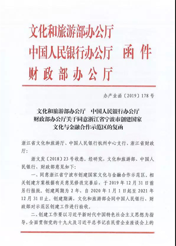 2月10日,文化和旅游部、中國(guó)人民銀行、財(cái)政部正式批復(fù),同意寧波創(chuàng)建國(guó)家文化與金融合作示范區(qū),創(chuàng)建時(shí)間從2020年1月至2021年12月。據(jù)“中經(jīng)文化產(chǎn)業(yè)”了解,目前全國(guó)僅兩個(gè)城市被列為創(chuàng)建國(guó)家文化與金融合作示范區(qū),另一個(gè)是北京市東城區(qū)。寧波憑什么被列為創(chuàng)建國(guó)家文化與金融合作示范區(qū)呢?我們一起來(lái)看看。