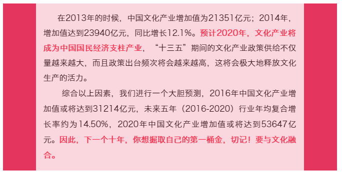 從上述多個轉型的成功案例可以看出,未來,中國轉型發(fā)展,一樣需要文化產(chǎn)業(yè)為龍頭,進行產(chǎn)業(yè)升級發(fā)展。文化與任何行業(yè)都息息相關,文化其可發(fā)揮和想象空間也是巨大的,文化所創(chuàng)造了產(chǎn)能和價值是任何一個傳統(tǒng)產(chǎn)業(yè)無法比擬的。