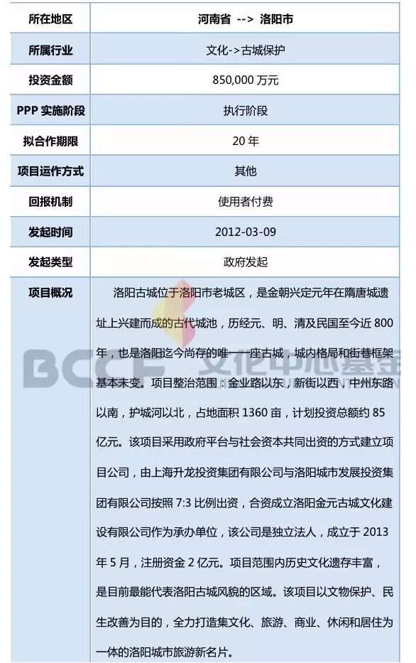 在文化類PPP項目的其他運作方式中,還有河南省洛陽古城保護與整治PPP項目。該項目共獲85億元的總投資,由洛陽市政府與上海升龍投資集團有限公司合作。該項目也是洛陽最大的棚戶區(qū)改造項目,建成后將成為以明清建筑風格為基調(diào),集文化展示、文化創(chuàng)意、文化商業(yè)于一體的文化示范區(qū)。