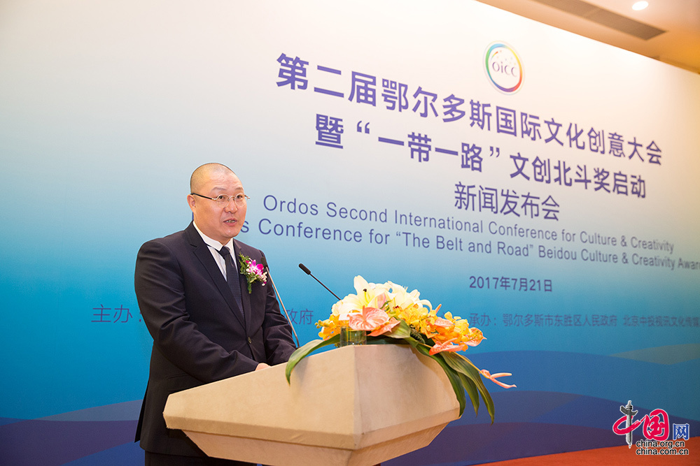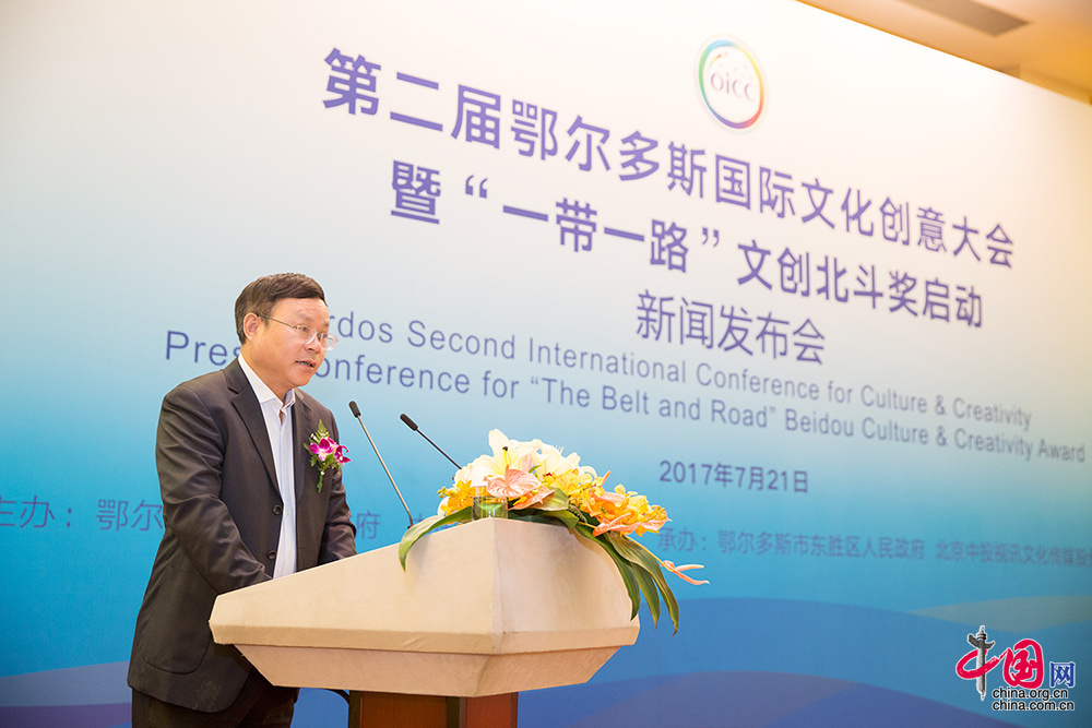 7月21日,第二屆鄂爾多斯國(guó)際文化創(chuàng)意大會(huì)暨“一帶一路”文創(chuàng)北斗獎(jiǎng)啟動(dòng)新聞發(fā)布會(huì)在北京釣魚臺(tái)國(guó)賓館召開。圖為鄂爾多斯市委副書記、市長(zhǎng)龔明珠在活動(dòng)中致辭。 中國(guó)網(wǎng) 楊佳 攝影