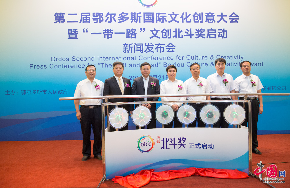 7月21日,第二屆鄂爾多斯國(guó)際文化創(chuàng)意大會(huì)暨“一帶一路”文創(chuàng)北斗獎(jiǎng)啟動(dòng)新聞發(fā)布會(huì)在北京釣魚臺(tái)國(guó)賓館召開。圖為與會(huì)嘉賓正式啟動(dòng)“一帶一路”文創(chuàng)北斗獎(jiǎng)。 中國(guó)網(wǎng) 楊佳 攝影