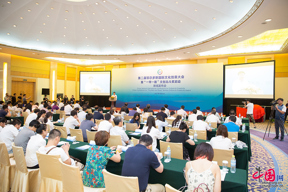 7月21日,第二屆鄂爾多斯國(guó)際文化創(chuàng)意大會(huì)暨“一帶一路”文創(chuàng)北斗獎(jiǎng)啟動(dòng)新聞發(fā)布會(huì)在北京釣魚臺(tái)國(guó)賓館召開。圖為新聞發(fā)布會(huì)現(xiàn)場(chǎng)。 中國(guó)網(wǎng) 楊佳 攝影