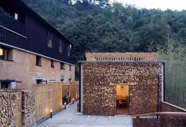 民宿云夕?戴家山設(shè)計(jì)取材于山林,設(shè)屋頂有掃帚墻,300把掃帚由莪山當(dāng)?shù)剞r(nóng)戶用自己種的掃帚草綁扎而成,用原始的木頭壘起來的外墻裝飾呈現(xiàn)了鄉(xiāng)土建筑最本真的設(shè)計(jì)格調(diào),貼近自然,返璞而生態(tài)。