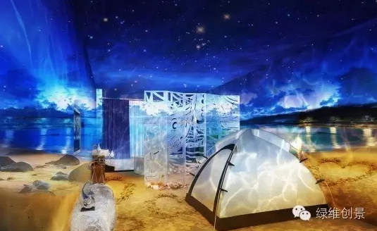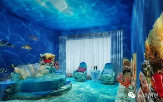 綠維浙江分院設(shè)計(jì)桃逸時(shí),大膽地將3D全息投影技術(shù)同民宿進(jìn)行無縫對(duì)接,借助3D全息投影技術(shù)模擬海上、海底和海灘的場景,投影本身內(nèi)置了真實(shí)的音效功能,可以從視覺、聽覺方面帶給客人不一樣的居住體驗(yàn)。