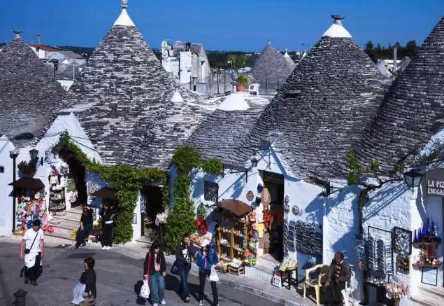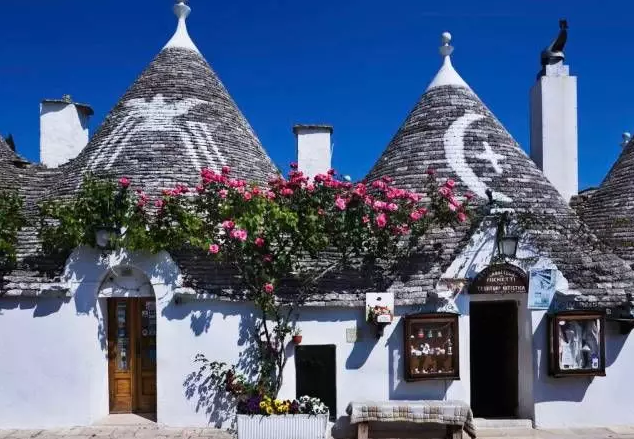 意大利的阿爾貝羅貝洛被人稱(chēng)為“天堂小鎮(zhèn)”,這里保存著1000多座造型奇特的圓錐石頂屋(Trulli),1996年,這里也被評(píng)為了世界文化遺產(chǎn)。許多圓錐屋頂都帶有十字架或某種怪異的圖案標(biāo)識(shí)。阿爾貝羅貝洛的意思是“美麗的橡樹(shù)”,走在小鎮(zhèn)的街道上,滿眼所見(jiàn)都是白色的圓錐石頂屋,在藍(lán)天的映襯下,就像是一個(gè)童話般的世界。