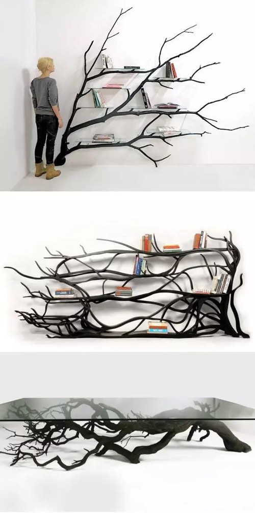木質書架,樹枝與玻璃組合起來,可以充當書架,也可以充當茶幾,絕對個性化,拒絕平凡。