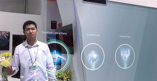 墻面上的鏡子不是一面普通的鏡子,人站到地面上的“電子秤”上后,鏡子上就會(huì)顯示人的體重、血壓等多項(xiàng)身體指標(biāo),還可以對(duì)每一項(xiàng)指標(biāo)進(jìn)行歷史信息的查詢,也可以提供實(shí)時(shí)顯示身體指標(biāo)狀況的健身項(xiàng)目,它采用了鏡面AR技術(shù)。