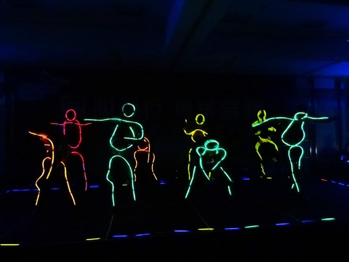 熒光舞,起源于歐美國(guó)家的派對(duì),在派對(duì)中人們利用各種熒光道具來(lái)裝點(diǎn)活動(dòng)氣氛,隨著不斷發(fā)展,熒光舞吸收了各種舞蹈所長(zhǎng),在滿足視覺(jué)上美感的同時(shí),也能帶來(lái)精神上的愉悅,觀賞熒光舞,無(wú)疑是種美的享受。熒光舞服就是表演這種創(chuàng)意舞蹈的基本道具,它主要利用一種發(fā)光材質(zhì)“ET冷光線”,把燈線縫制或黏貼到衣服上,裝上電池即可使用。