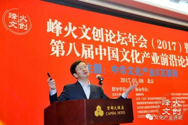 1月8日,以“中華文化產(chǎn)業(yè)X互聯(lián)網(wǎng)”為主題的,峰火文創(chuàng)論壇年會(2017)暨第八屆中國文化產(chǎn)業(yè)前沿論壇,在首都大酒店舉辦。民建中央副主席周漢民,國家行政學(xué)院原副院長周文彰,光線傳媒董事長王長田,中國文化管理協(xié)會副主席徐國寶,企鵝影視電影投資業(yè)務(wù)部總經(jīng)理常斌,北京大學(xué)文化產(chǎn)業(yè)研究院研究員、北大文化集團(tuán)總裁許曉峰,北京大學(xué)文化產(chǎn)業(yè)研究院副院長陳少峰等發(fā)表精彩演講。
