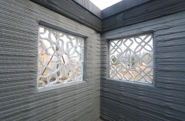 建房的材料是水泥混凝土,與普通人造房屋不同,3D打印出來的墻體是凹凸不平的波浪形。造房的整個過程都是由電腦程序控制完成。按照設(shè)計(jì)圖,用3D打印機(jī)噴嘴噴出高密度、高性能混凝土,逐層打印出墻壁和隔間、裝飾等。再用機(jī)械手臂完成整座房子的基本架構(gòu)。