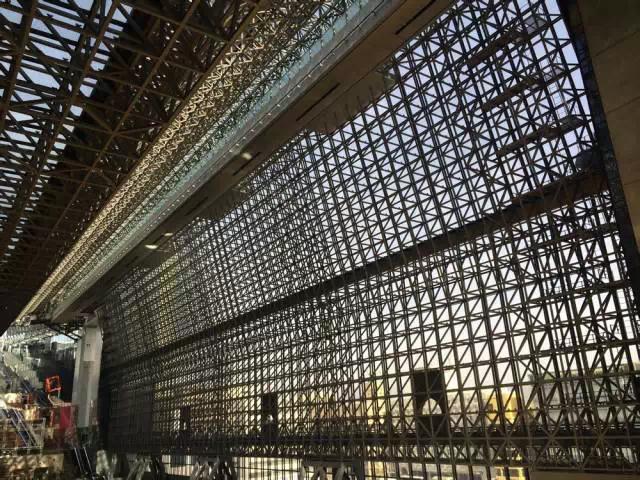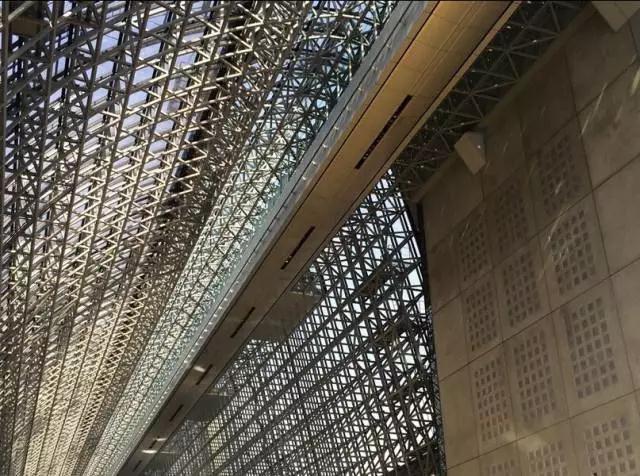 京都車站大樓由原廣司設計事務所設計,原廣司在建筑的“虛實結(jié)合”方面頗有研究,他創(chuàng)造了所謂“有孔理論”的概念,試圖通過“開孔”而將“死空間”轉(zhuǎn)化為富有生氣的“活空間”,并借助于“反向和反轉(zhuǎn)”的設計觀念來創(chuàng)造出一種虛幻的空間景象。