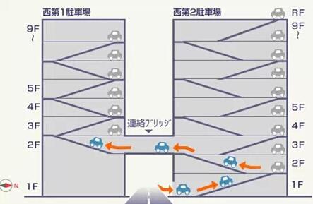 東側(cè)停車場位于酒店的地下三層,可直達酒店前臺大廳;西1停車場位于主樓最西端1至9樓,與伊勢丹相連;西2停車場則是位于主樓對面的一座副樓,通過3層的通道與西1停車場聯(lián)通。