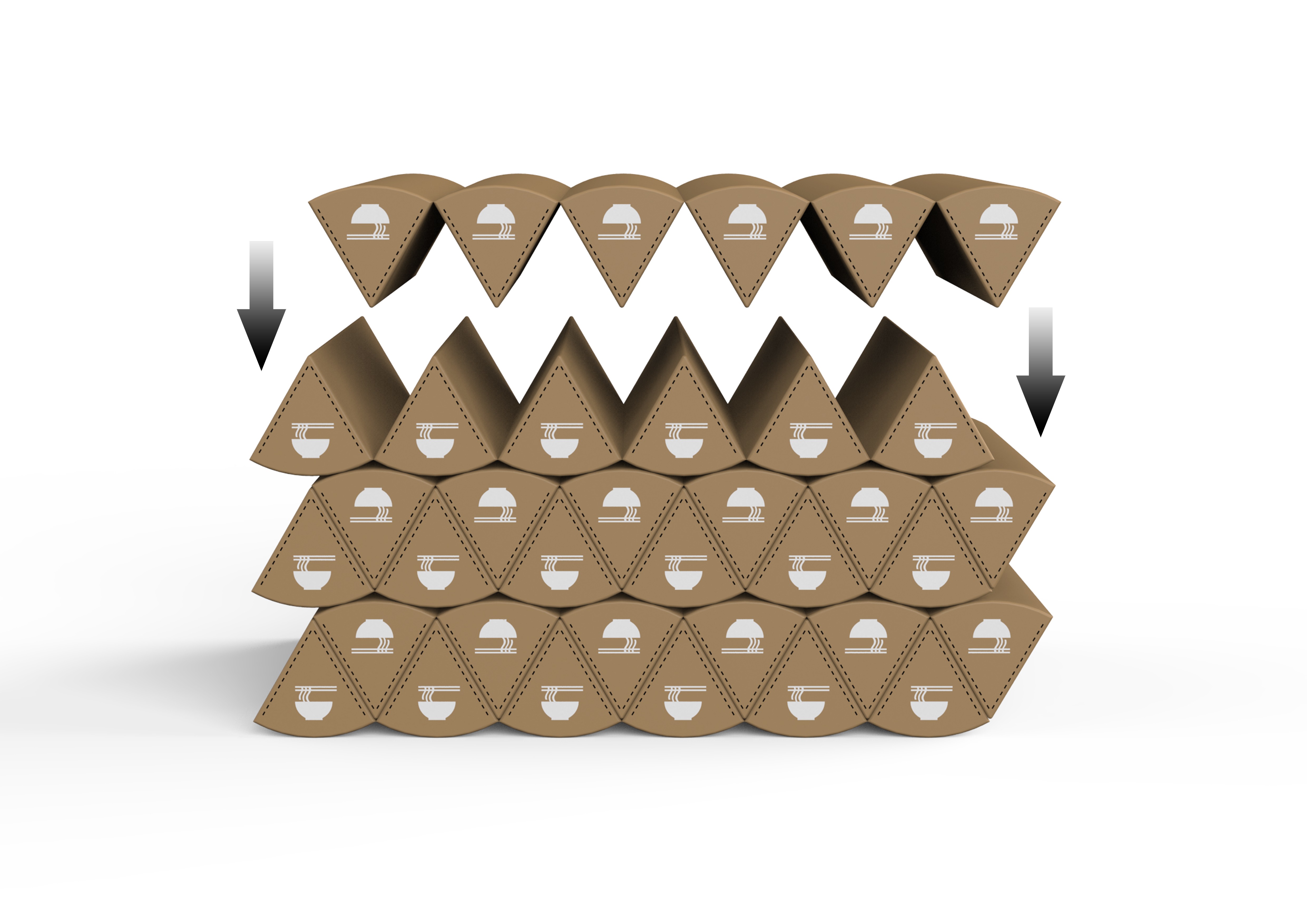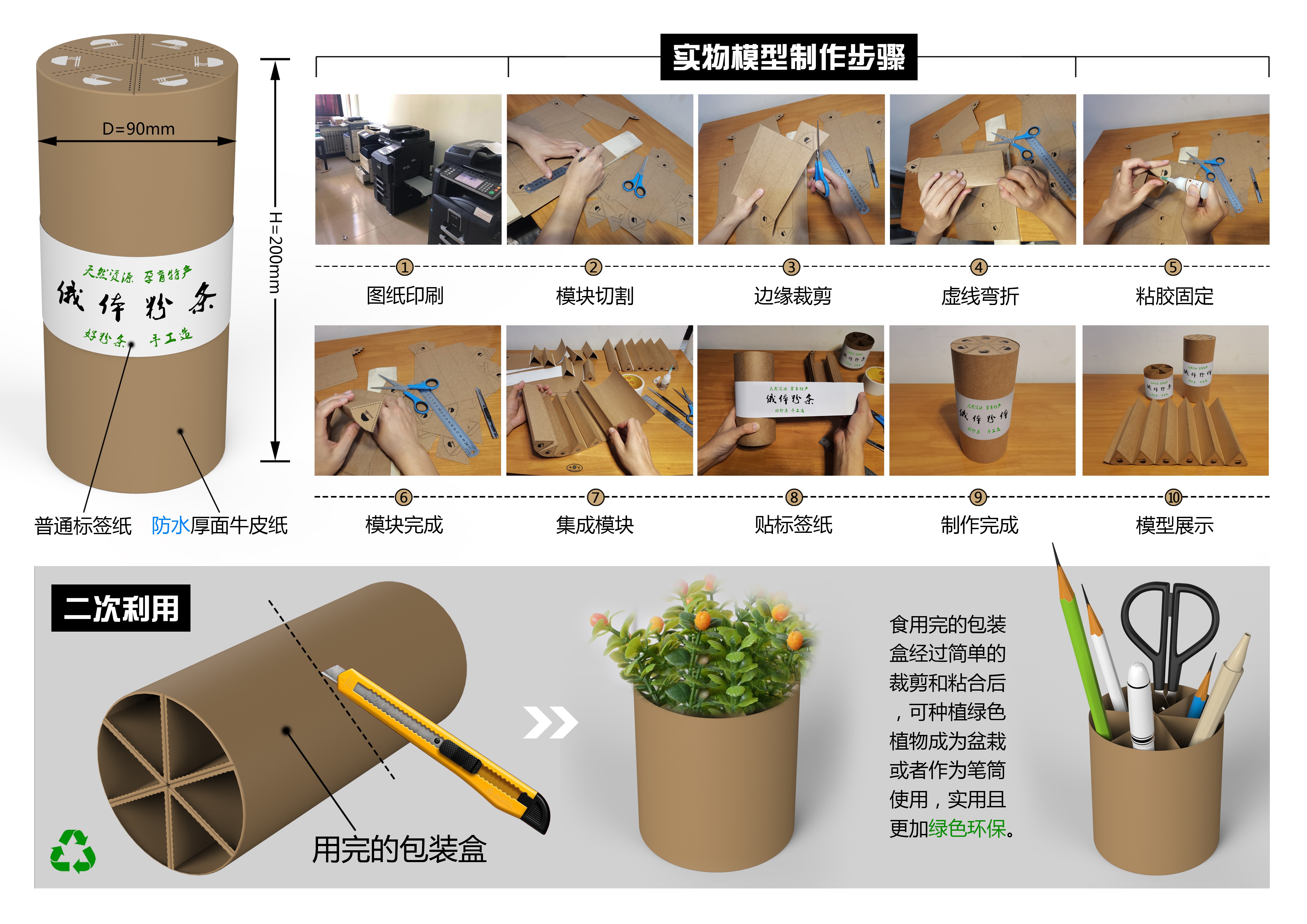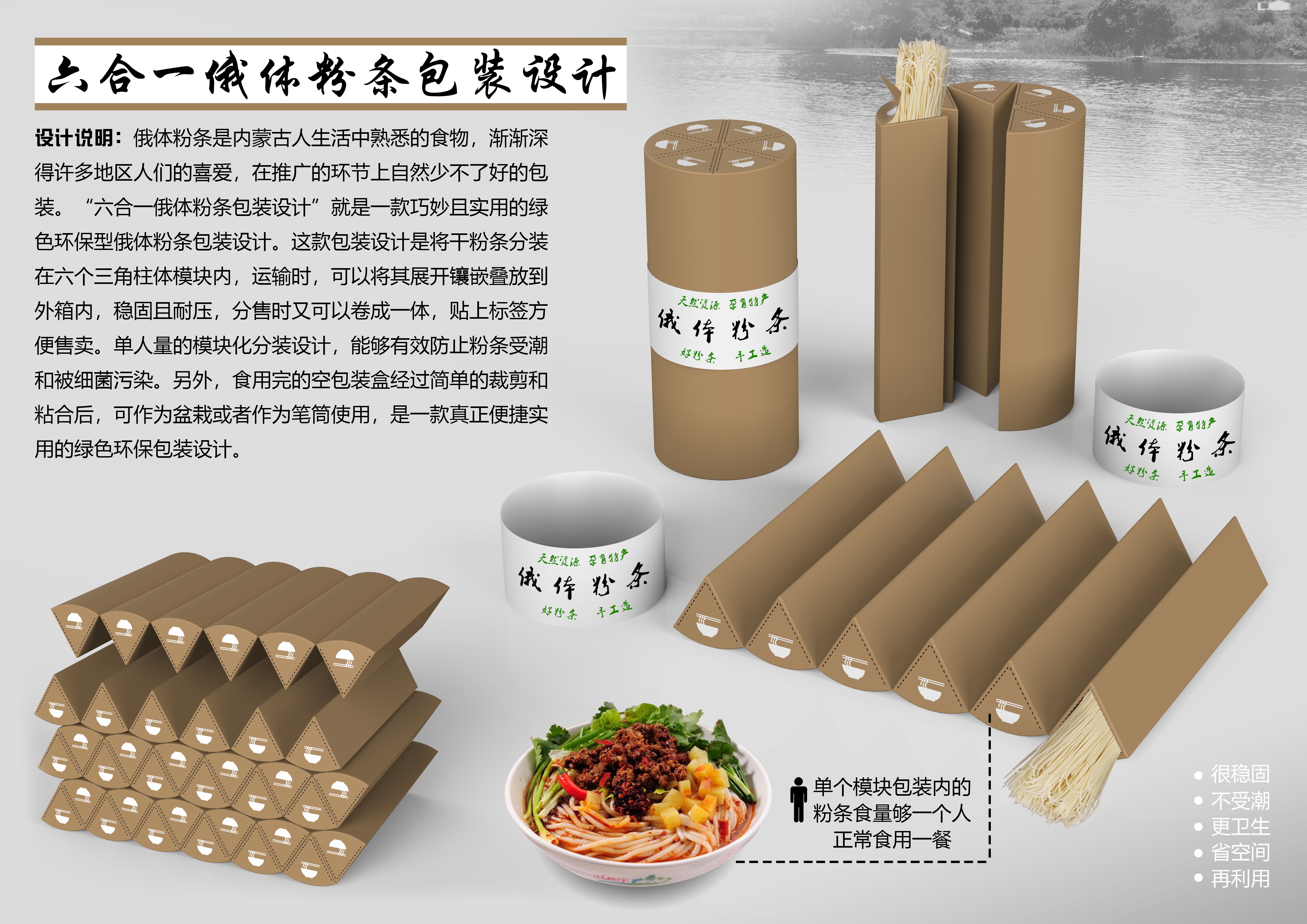 “六合一俄體粉條包裝設(shè)計(jì)”就是一款巧妙且實(shí)用的綠色環(huán)保型俄體粉條包裝設(shè)計(jì)。這款包裝設(shè)計(jì)是將干粉條分裝在六個(gè)三角柱體模塊內(nèi),運(yùn)輸時(shí),可以將其展開鑲嵌疊放到外箱內(nèi),穩(wěn)固且耐壓,分售時(shí)又可以卷成一體,貼上標(biāo)簽方便售賣。單人量的模塊化分裝設(shè)計(jì),能夠有效防止粉條受潮和被細(xì)菌污染。另外,食用完的空包裝盒經(jīng)過簡單的裁剪和粘合后,可作為盆栽或者作為筆筒使用,是一款真正便捷實(shí)用的綠色環(huán)保包裝設(shè)計(jì)。