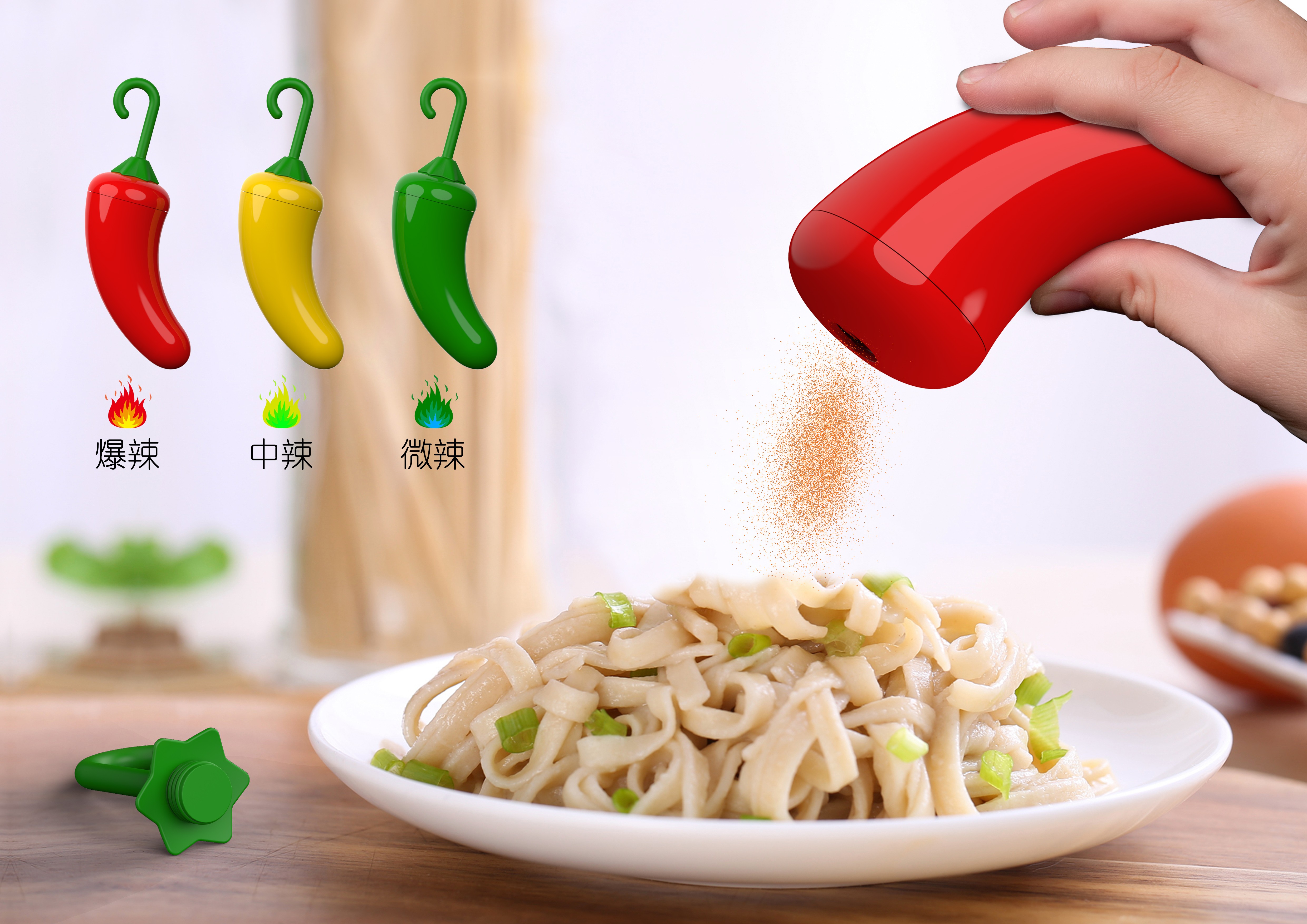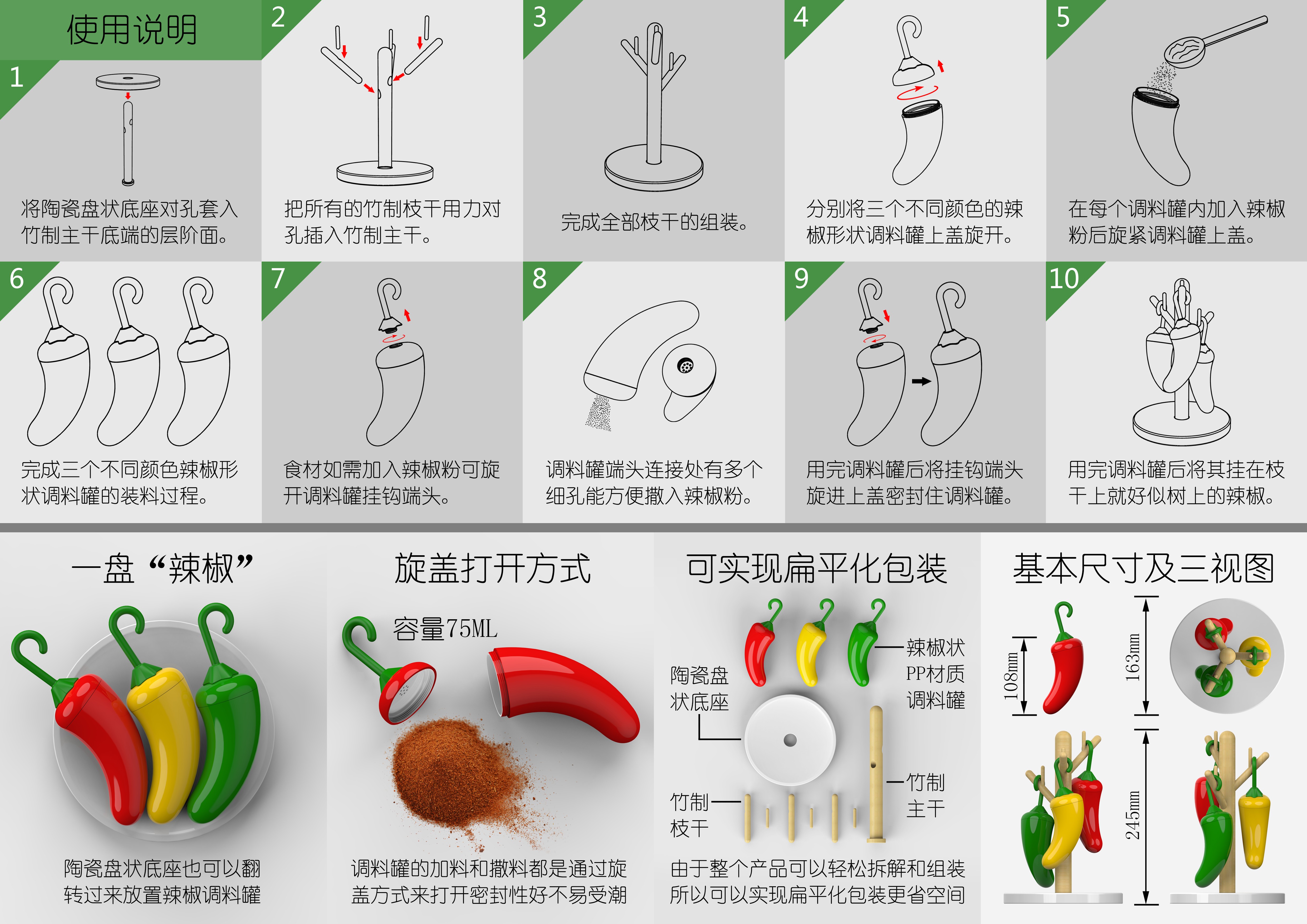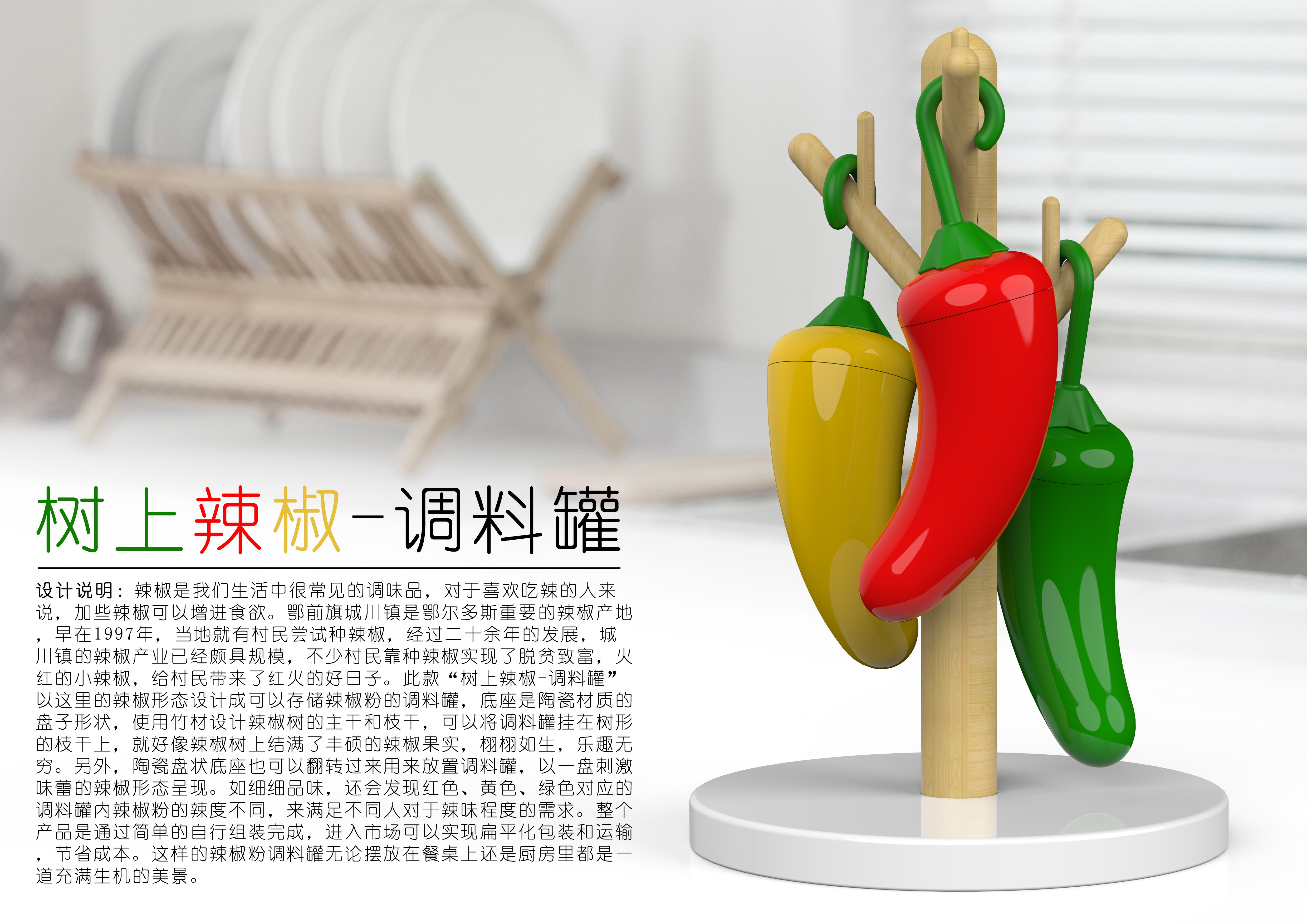 此款“樹上辣椒-調(diào)料罐”以這里的辣椒形態(tài)設計成可以存儲辣椒粉的調(diào)料罐,底座是陶瓷材質(zhì)的盤子形狀,使用竹材設計辣椒樹的主干和枝干,可以將調(diào)料罐掛在樹形的枝干上,就好像辣椒樹上結(jié)滿了豐碩的辣椒果實,栩栩如生,樂趣無窮。另外,陶瓷盤狀底座也可以翻轉(zhuǎn)過來用來放置調(diào)料罐,以一盤刺激味蕾的辣椒形態(tài)呈現(xiàn)。如細細品味,還會發(fā)現(xiàn)紅色、黃色、綠色對應的調(diào)料罐內(nèi)辣椒粉的辣度不同,來滿足不同人對于辣味程度的需求。
