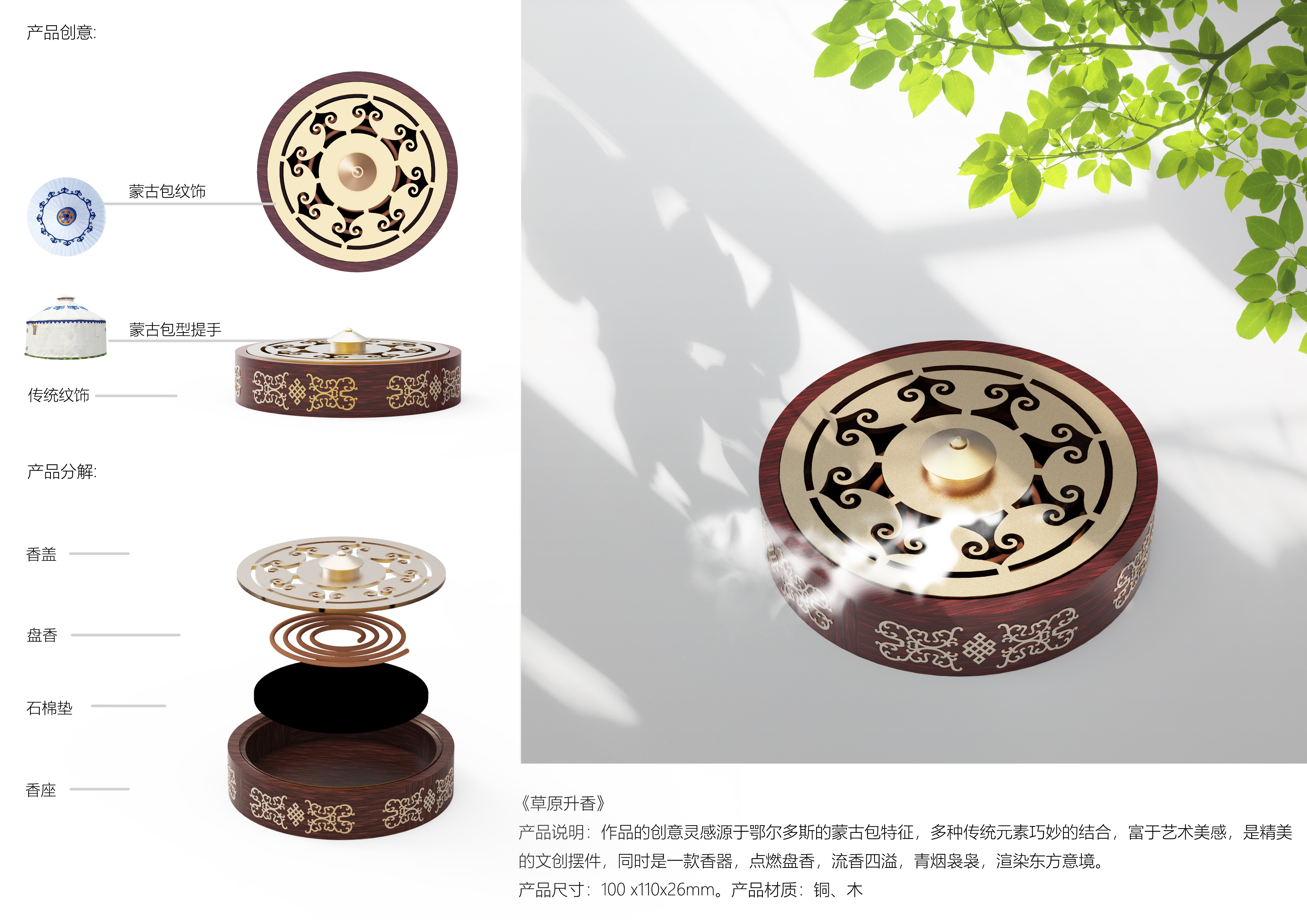 創(chuàng)作思路:作品的創(chuàng)意靈感源于鄂爾多斯的蒙古包特征,多種傳統(tǒng)元素巧妙的結(jié)合,富于藝術(shù)美感,是精美的文創(chuàng)擺件,同時是一款香器,點燃盤香,流香四溢,青煙裊裊,渲染東方意境。