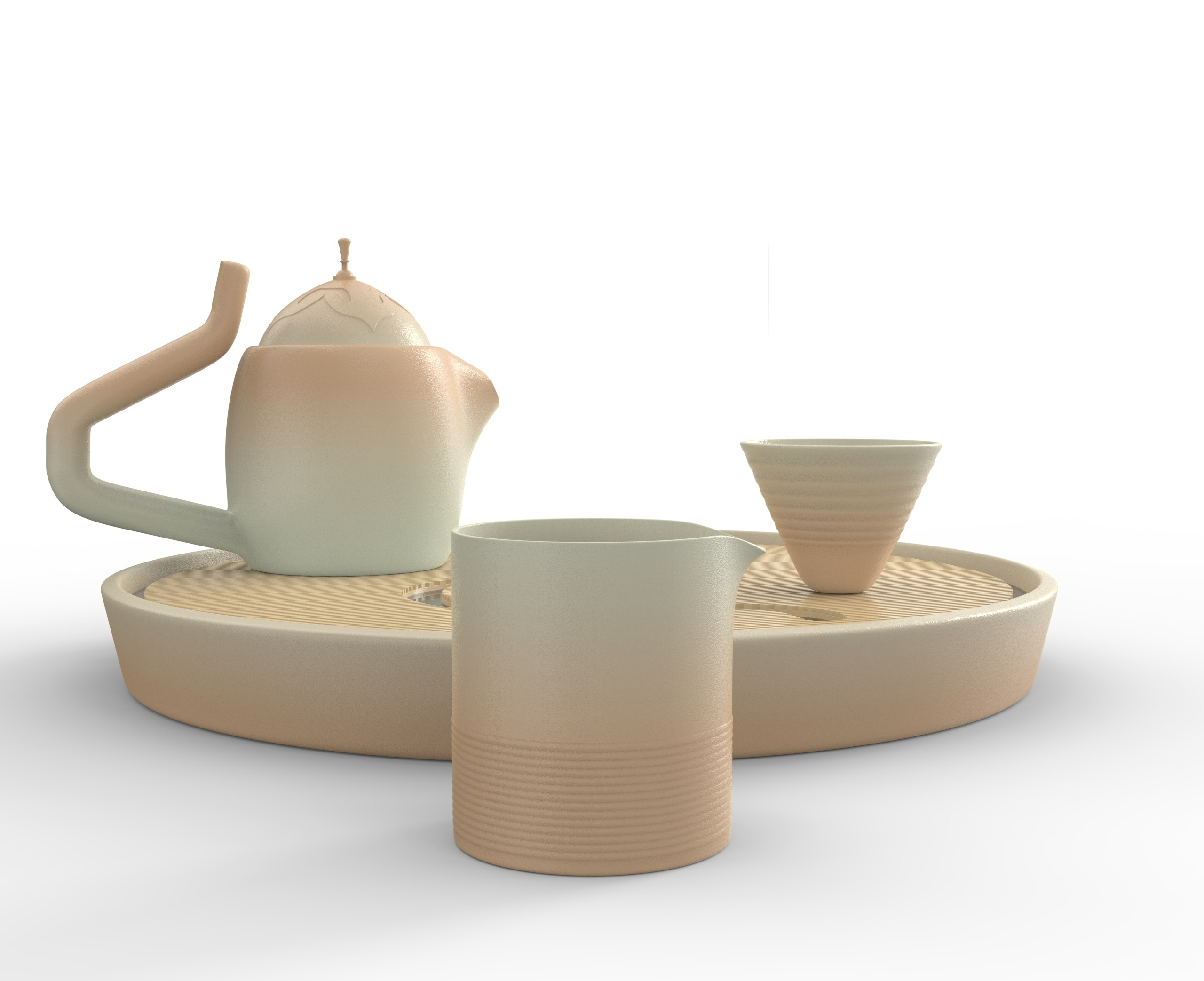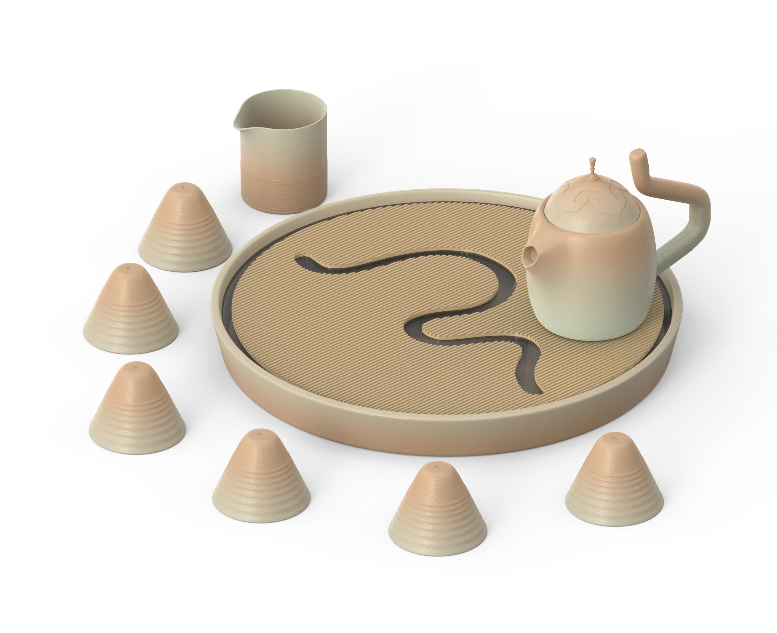 創(chuàng)作思路:結(jié)合黃河“幾”字灣的地形和色彩制作出一套茶具