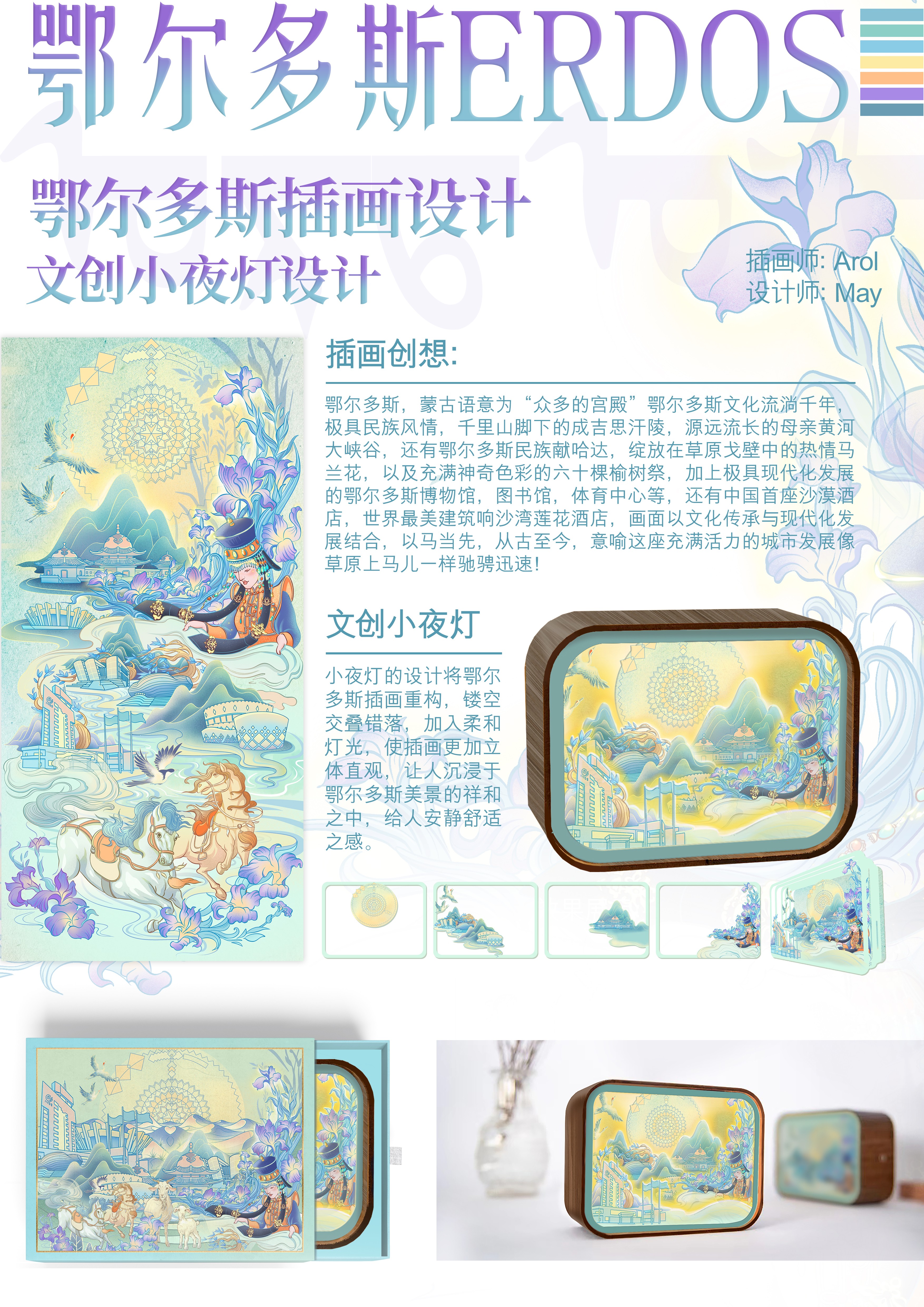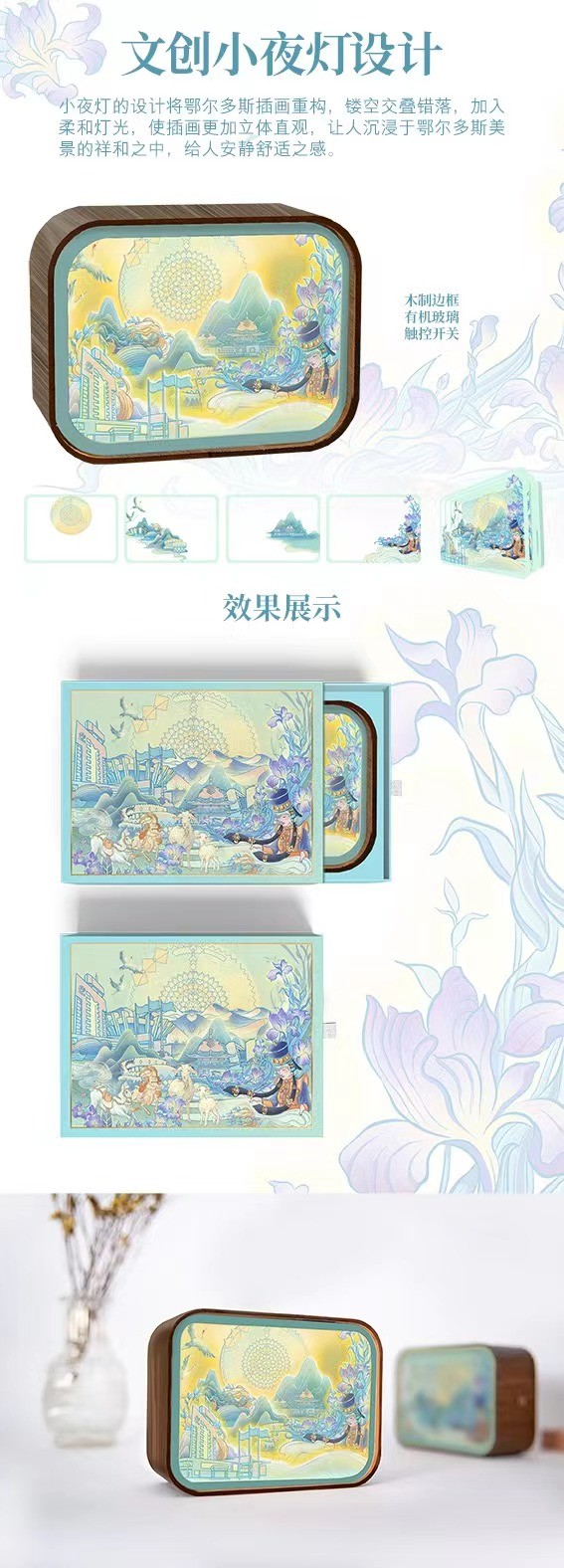 尋跡鄂爾多斯·立體文創(chuàng)小夜燈:采用鏤空雕刻設(shè)計(jì),將鄂爾多斯插畫重構(gòu),加入柔和燈光,使插畫更加立體直觀,讓人沉浸在鄂爾多斯美景的祥和之中,給人安靜舒適之感。