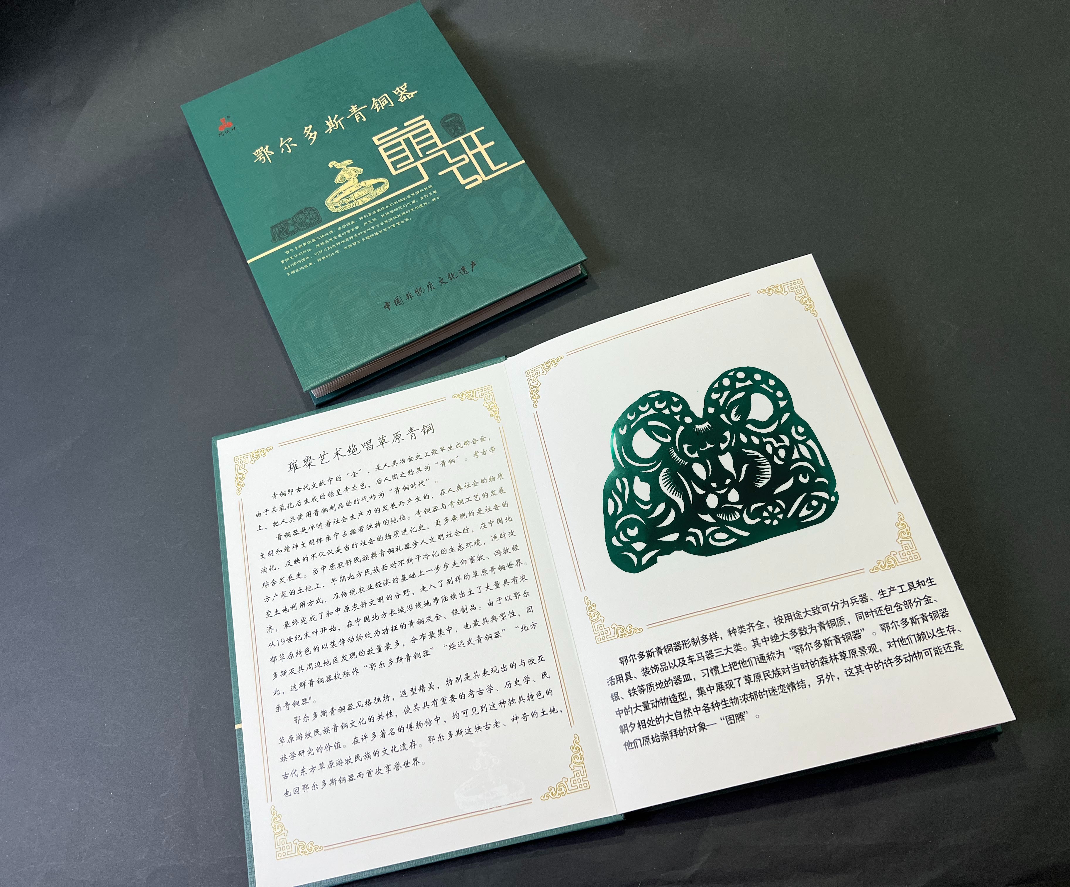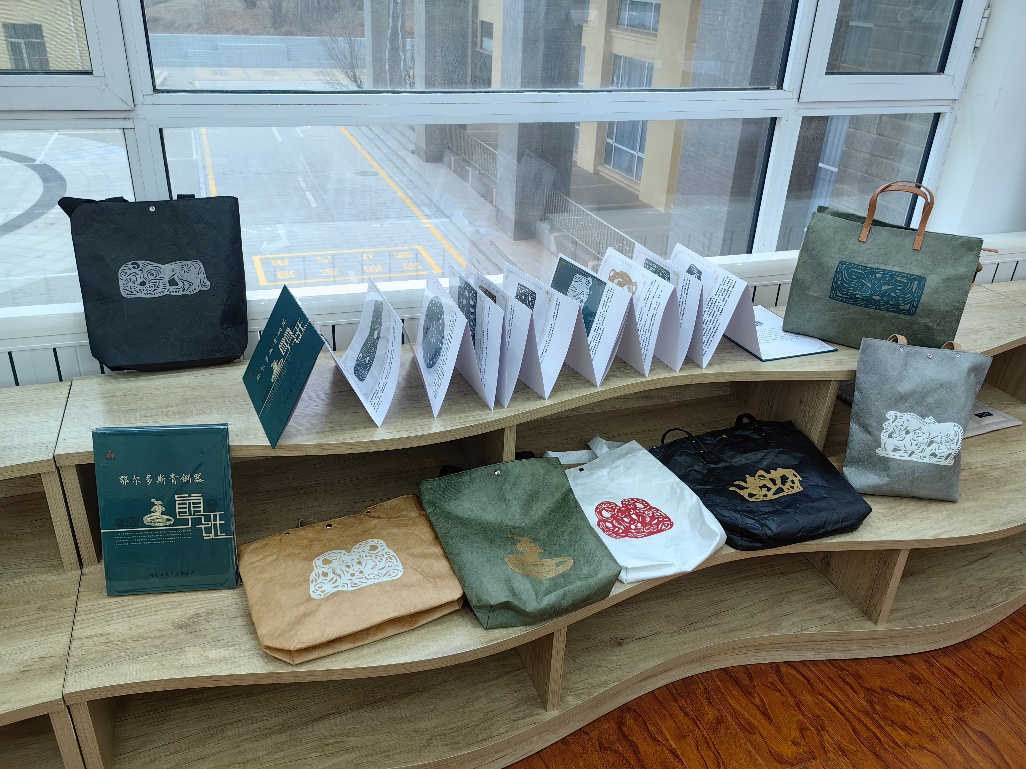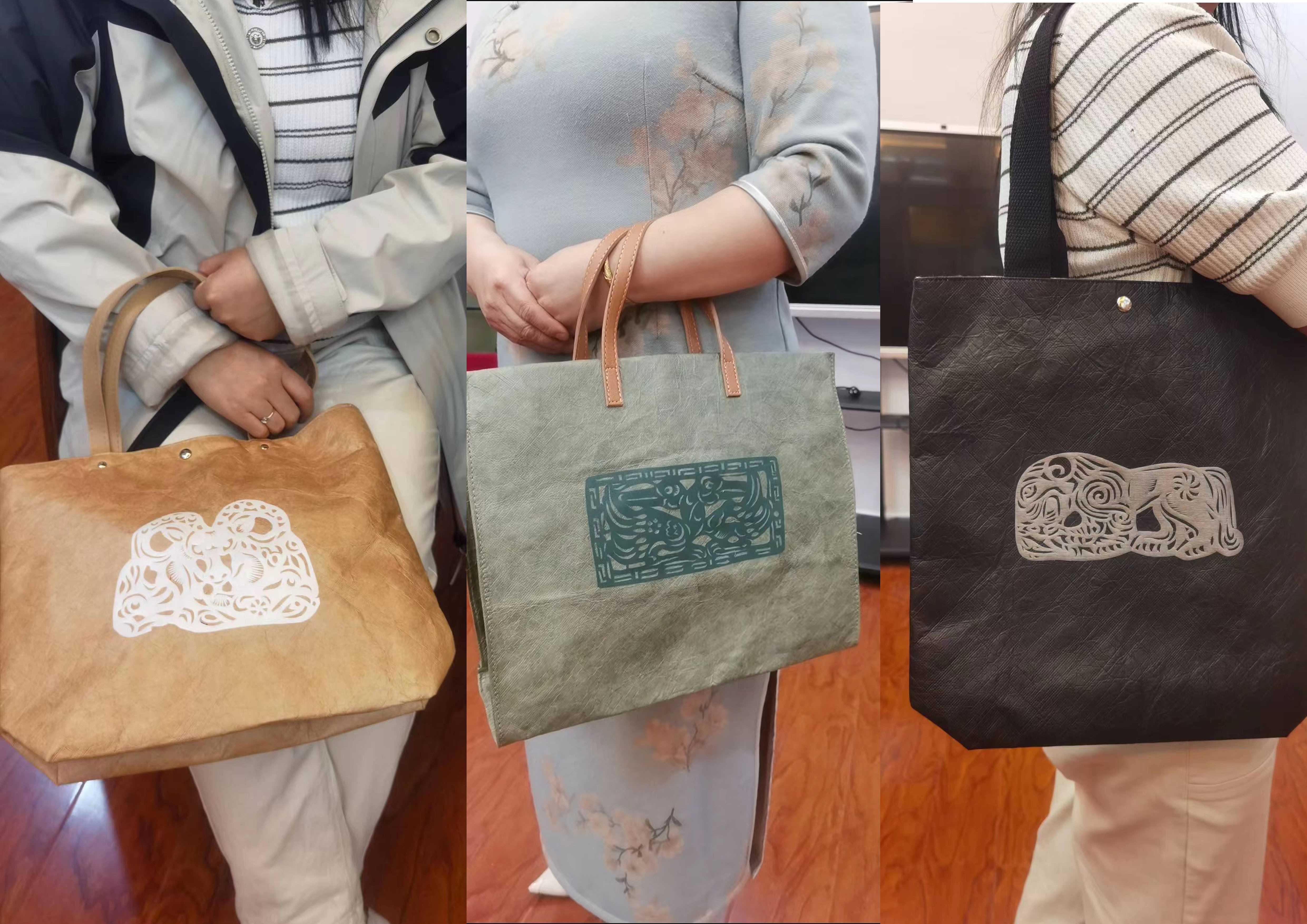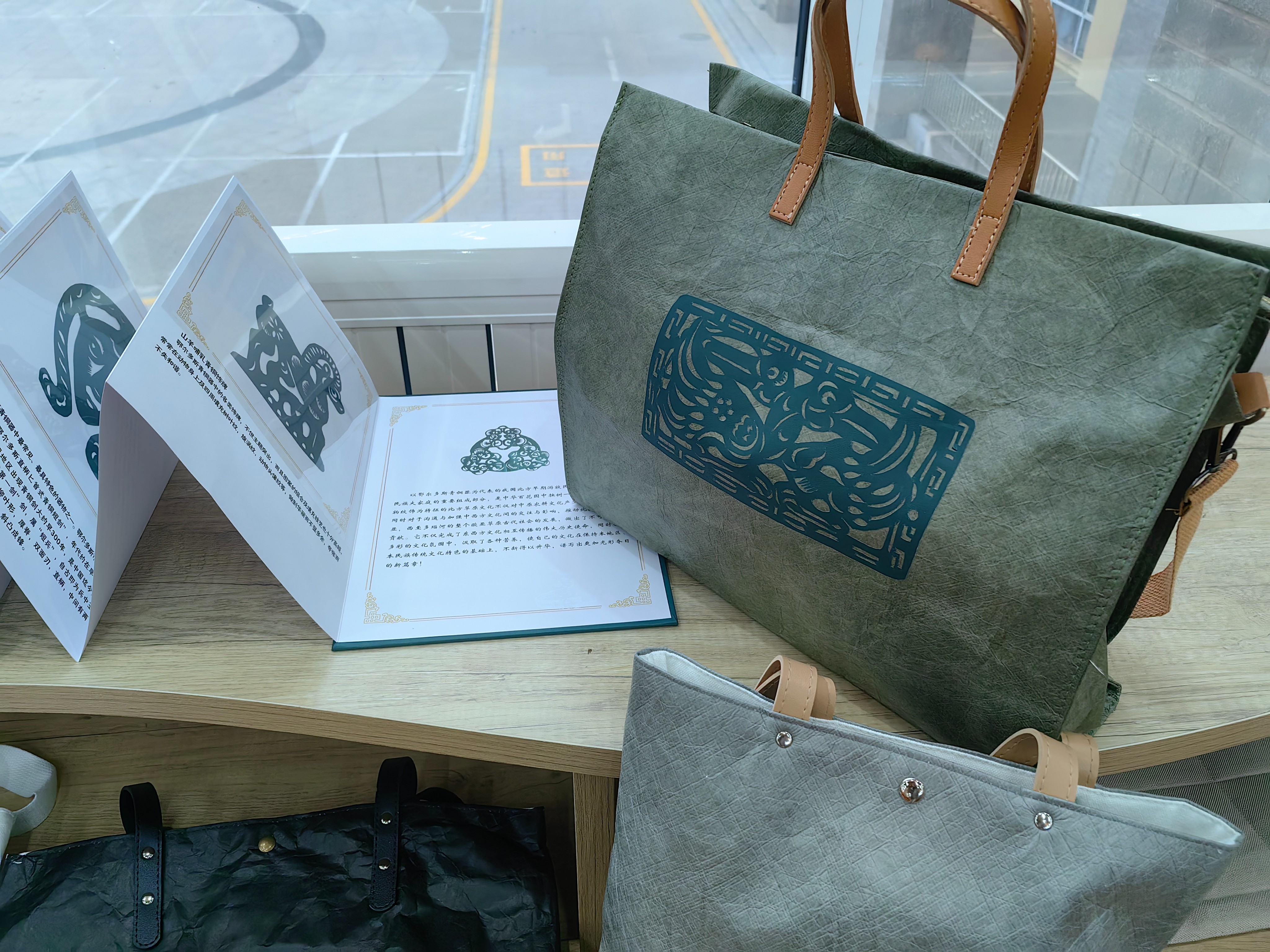 創(chuàng)作思路:鄂爾多斯青銅器其文化內(nèi)涵豐富、造型生動、具有很高的觀賞價值和藝術(shù)價值,剪紙冊采用風(fēng)琴頁設(shè)計,剪紙可以單獨(dú)展示也可以長卷展示。里面精選具有代表性的20張青銅器剪紙作品。包包是采用俗稱“會呼吸的紙”杜邦紙制作而成,上面飾以各種青銅剪紙紋樣,柔韌抗撕裂,防水、防曬,好清潔,環(huán)保 可降解。相比起普通純色包包更耐看和精致。