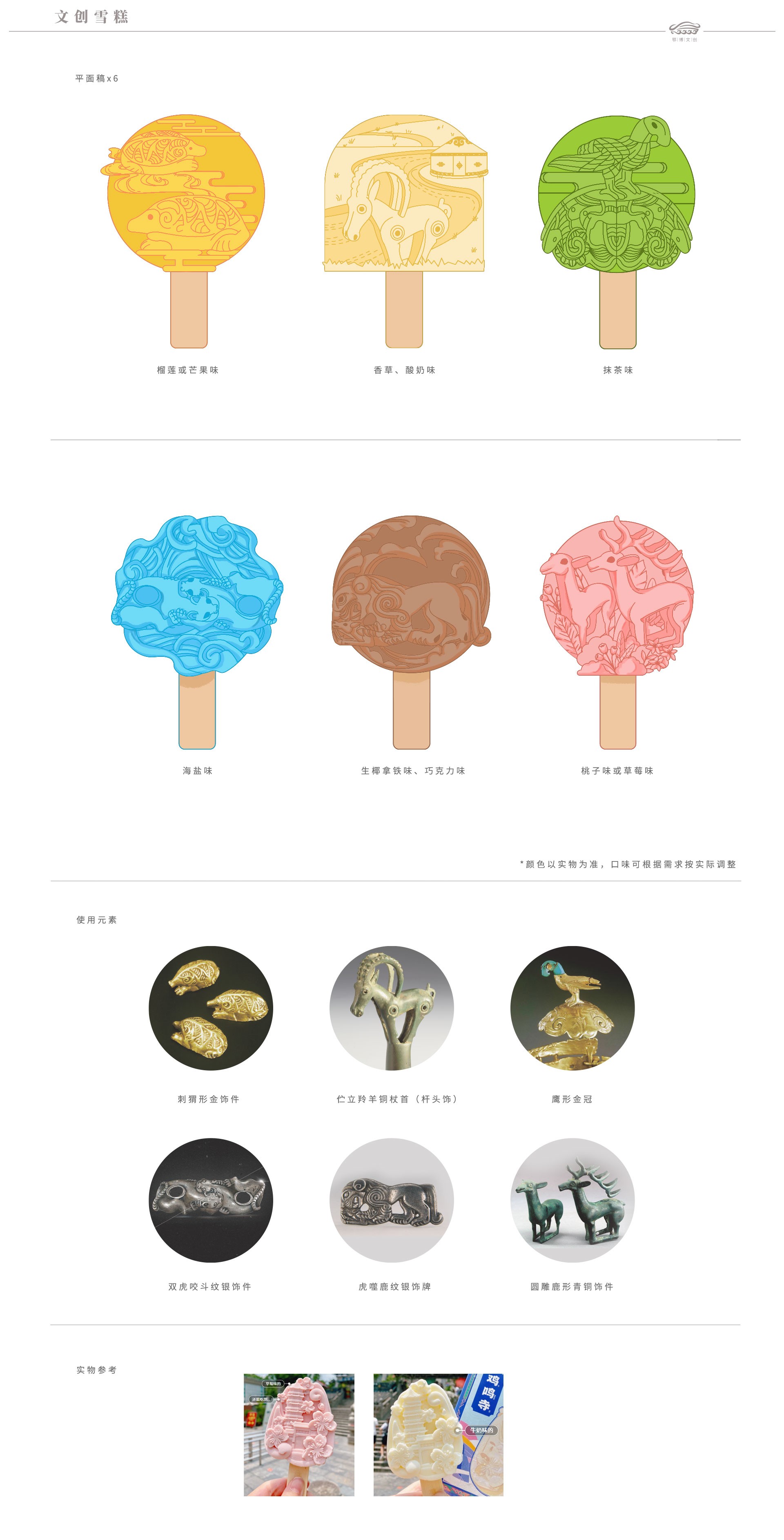 創(chuàng)作思路:選取鄂爾多斯青銅器中六件精美的文物,提取文物上的動(dòng)物造型及紋飾,設(shè)計(jì)為文創(chuàng)雪糕,讓大眾品嘗特色文創(chuàng)雪糕的同時(shí),也可以感受鄂爾多斯?fàn)N爛的文化,通過(guò)拍照打卡,讓更多人了解額爾地拍搜、來(lái)到鄂爾多斯。