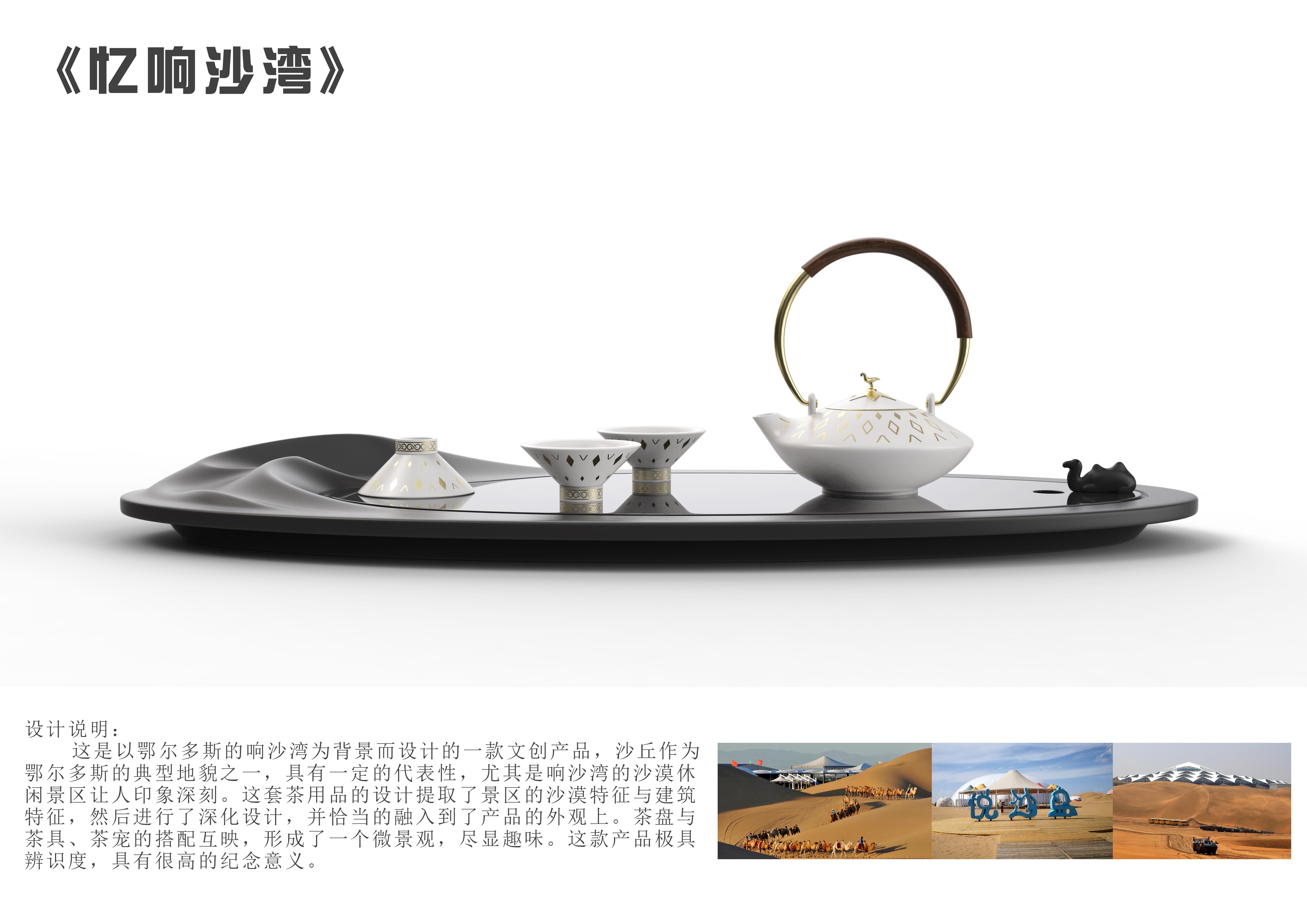 創(chuàng)作思路:以鄂爾多斯的響沙灣為背景而設(shè)計(jì)的一款文創(chuàng)產(chǎn)品,提取了景區(qū)的沙漠特征與建筑特征,進(jìn)行了深化,并恰當(dāng)?shù)娜谌氲搅水a(chǎn)品的外觀上。