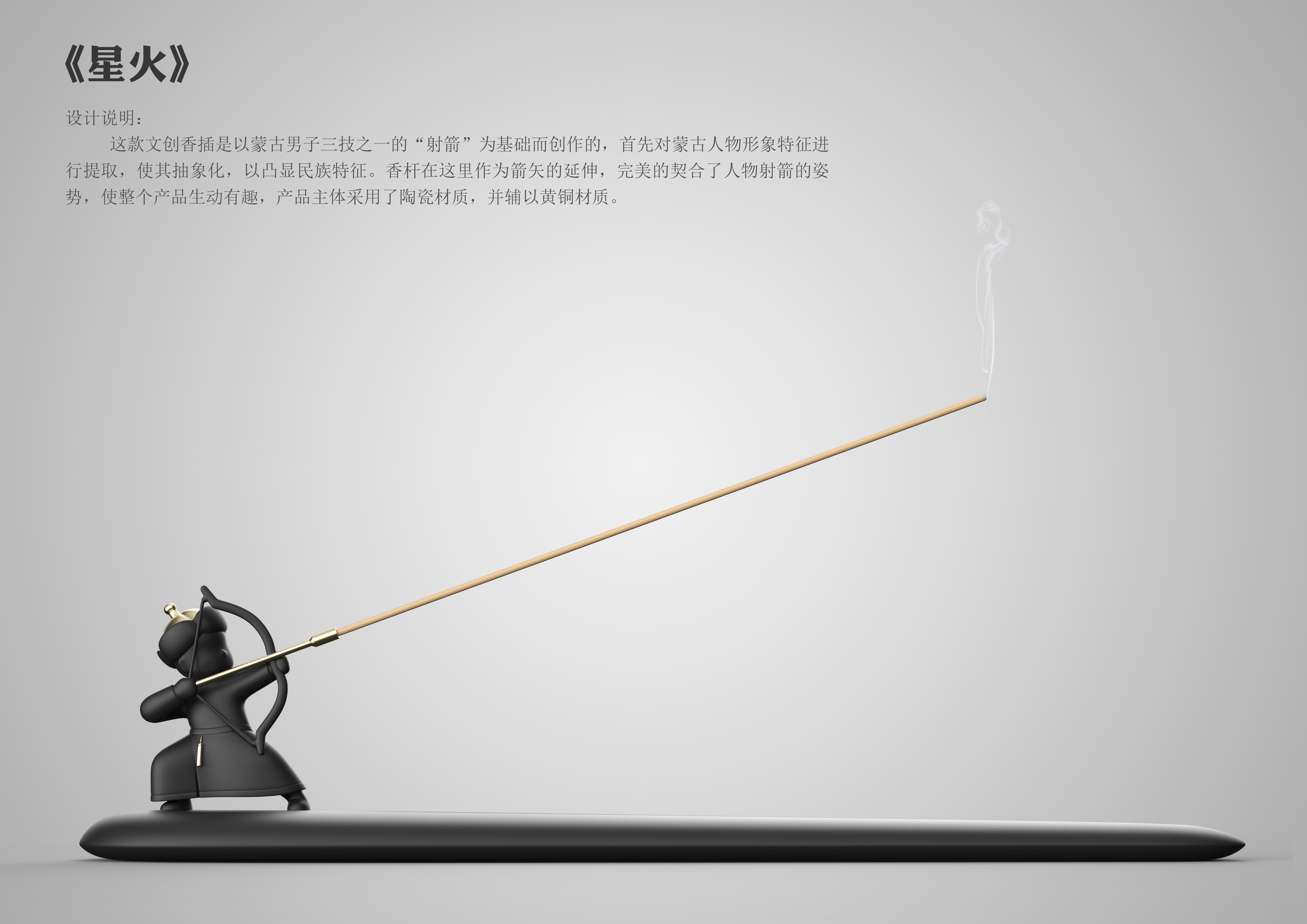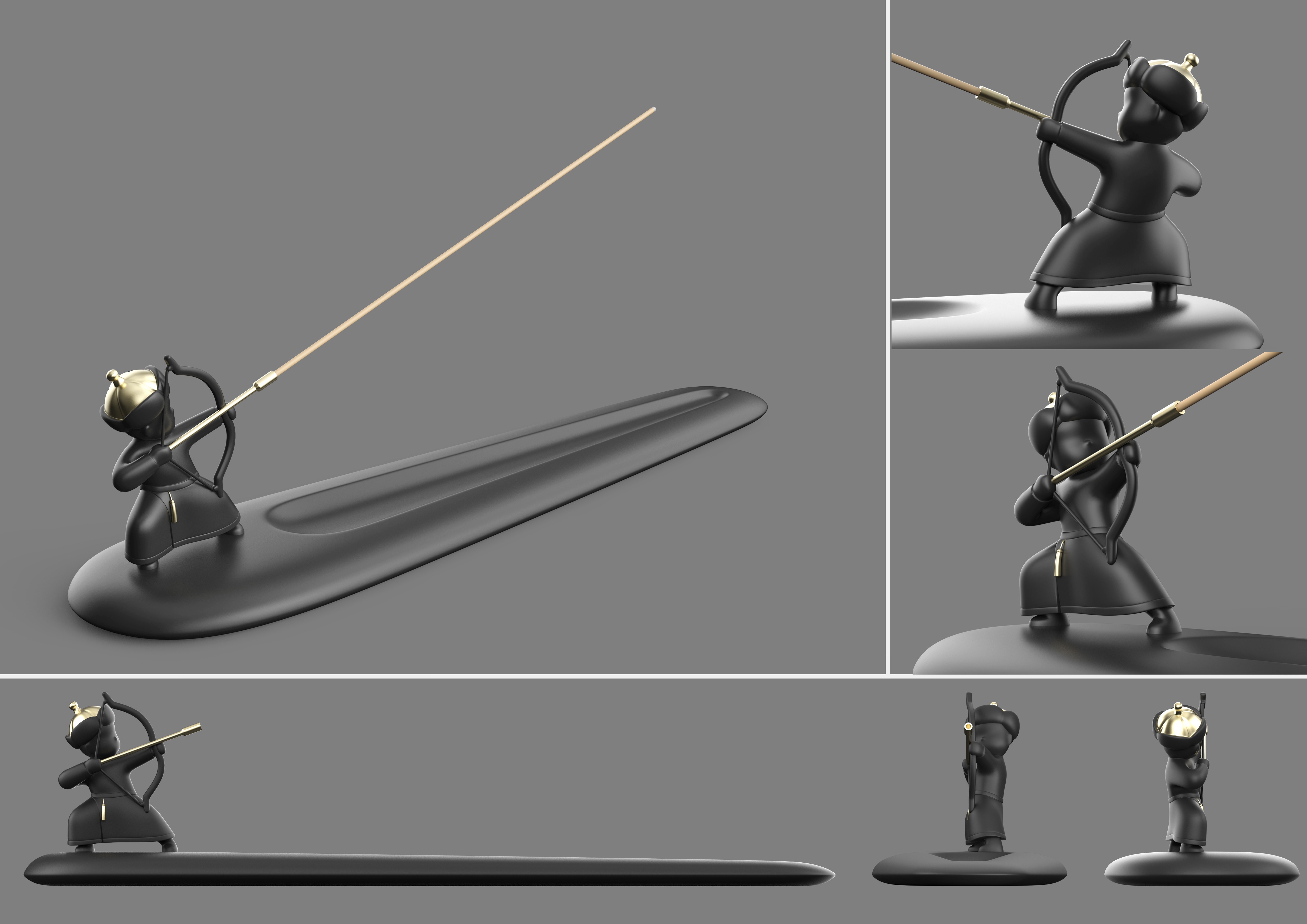 設(shè)計(jì)理念:利用香桿的造型作為箭矢的延伸,完美的契合了人物射箭的姿勢(shì),使整個(gè)產(chǎn)品生動(dòng)有趣。凸顯了名族特征。