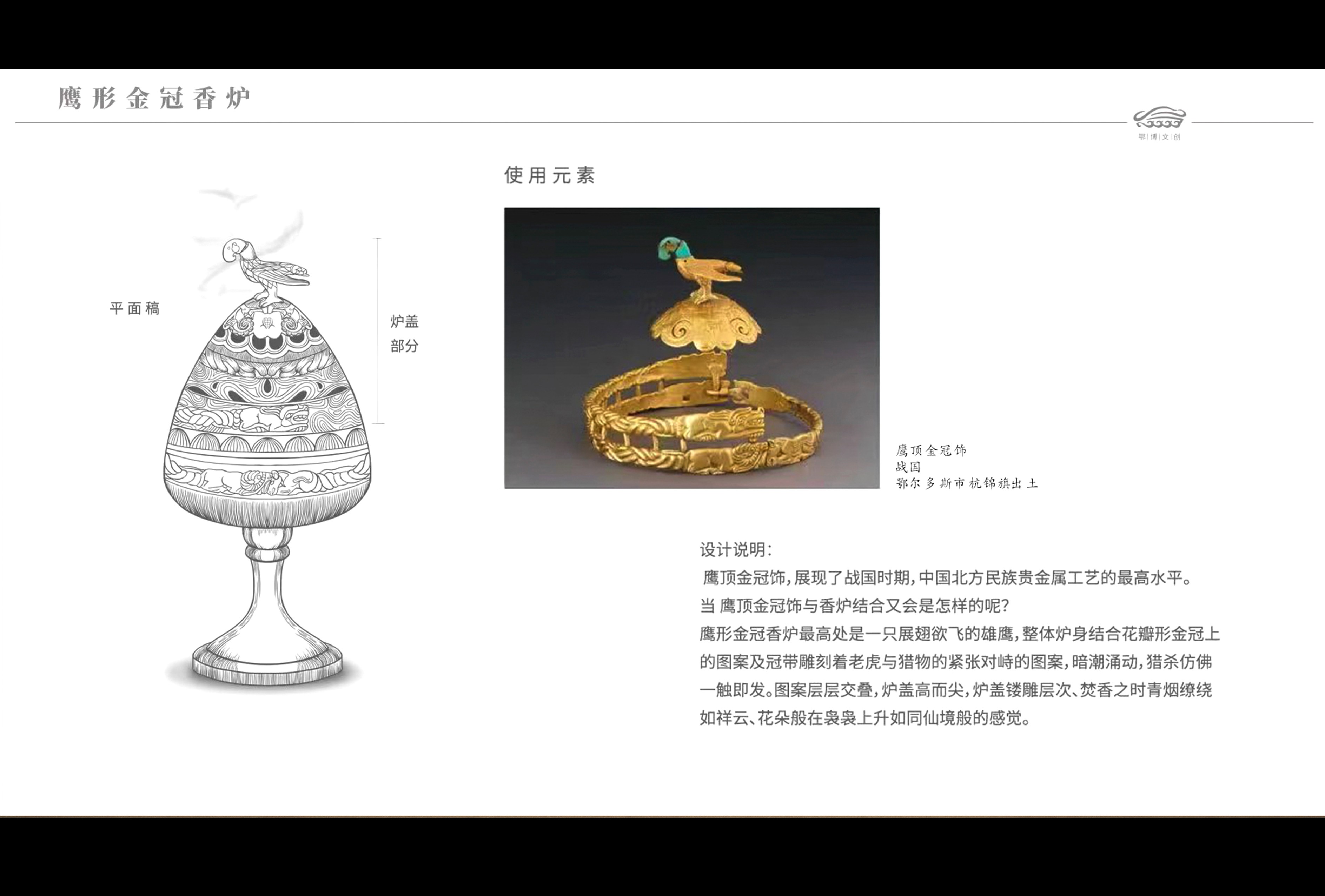 創(chuàng)作思路:鷹頂金冠飾,展現(xiàn)了戰(zhàn)國時期,中國北方民族貴金屬工藝的最高水平。鷹形金冠香爐頂部是一只展翅欲飛的雄鷹,整體爐身結(jié)合花瓣形金冠上的圖案及冠帶雕刻著老虎與獵物的緊張對峙的圖案,暗潮涌動,獵殺仿佛一觸即發(fā)。圖案層層交疊,爐蓋高而尖,爐蓋鏤雕層次、焚香之時青煙繚繞如祥云、花朵般在裊裊上升如同仙境般的感覺。