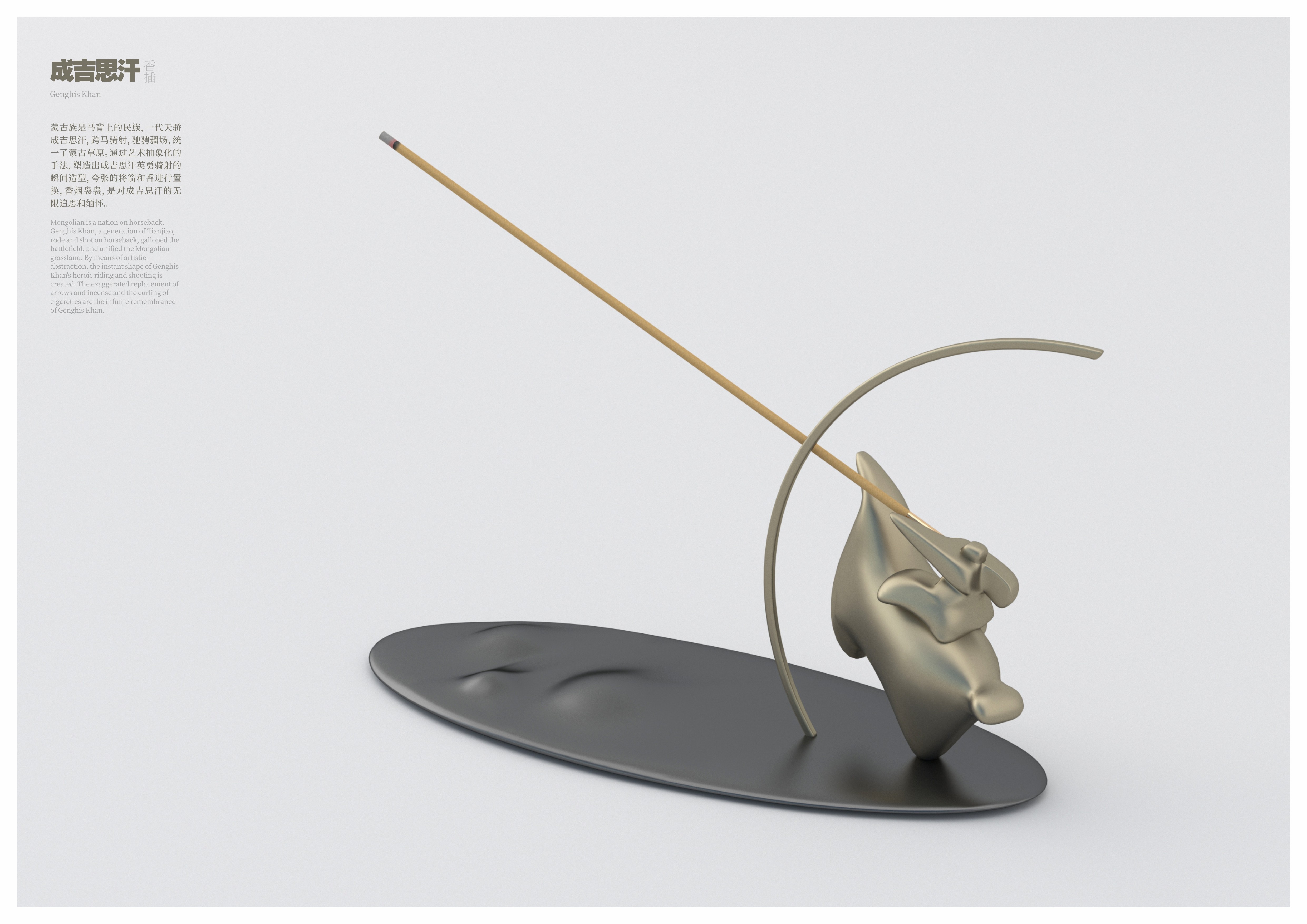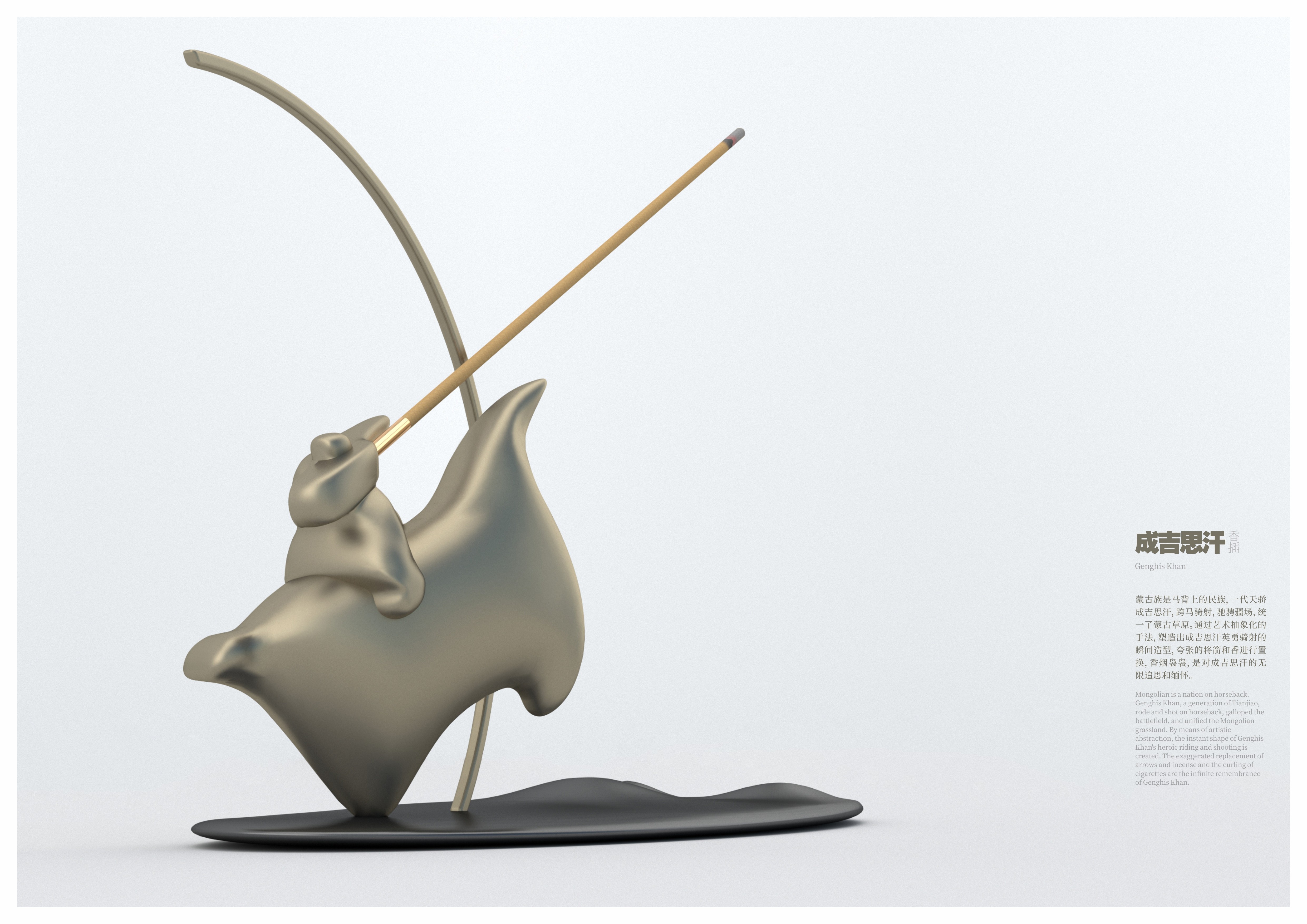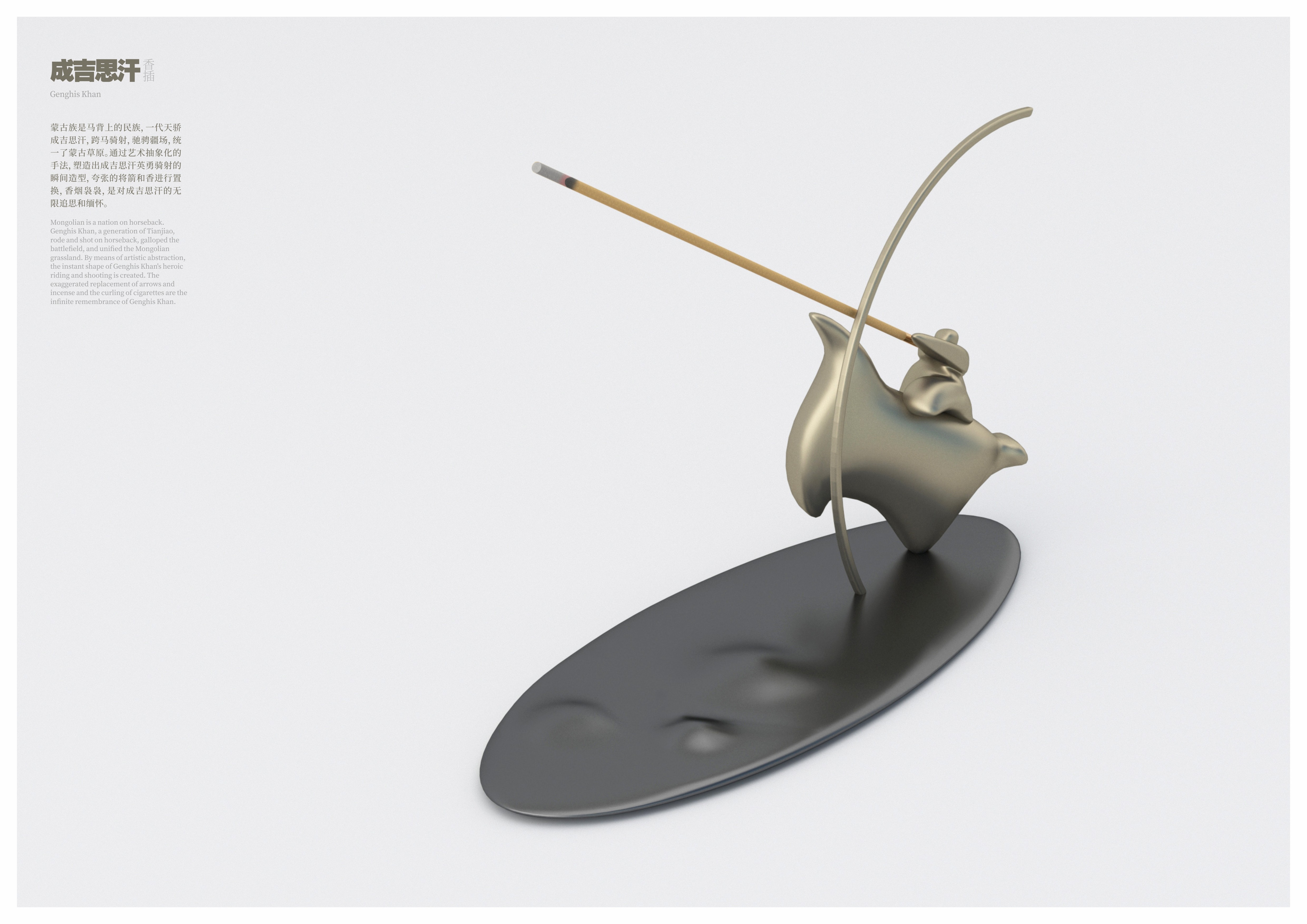 創(chuàng)作思路:蒙古族是馬背上的民族,一代天驕成吉思汗,跨馬騎射,馳騁疆場,統(tǒng)一了蒙古草原。通過藝術(shù)抽象化的手法,塑造出成吉思汗英勇騎射的瞬間造型,將箭和香進行置換,香煙裊裊,是對成吉思汗的無限追思和緬懷。