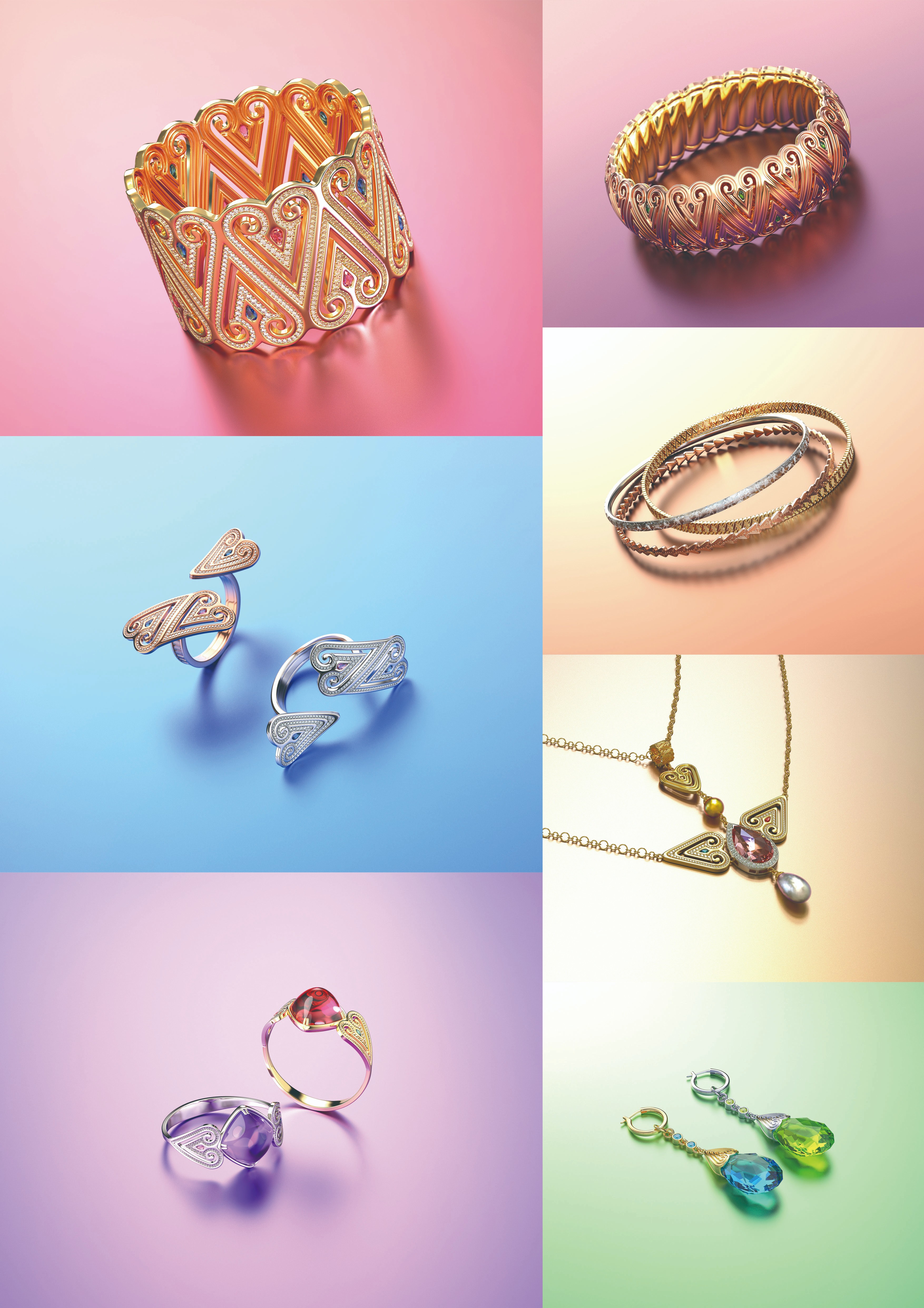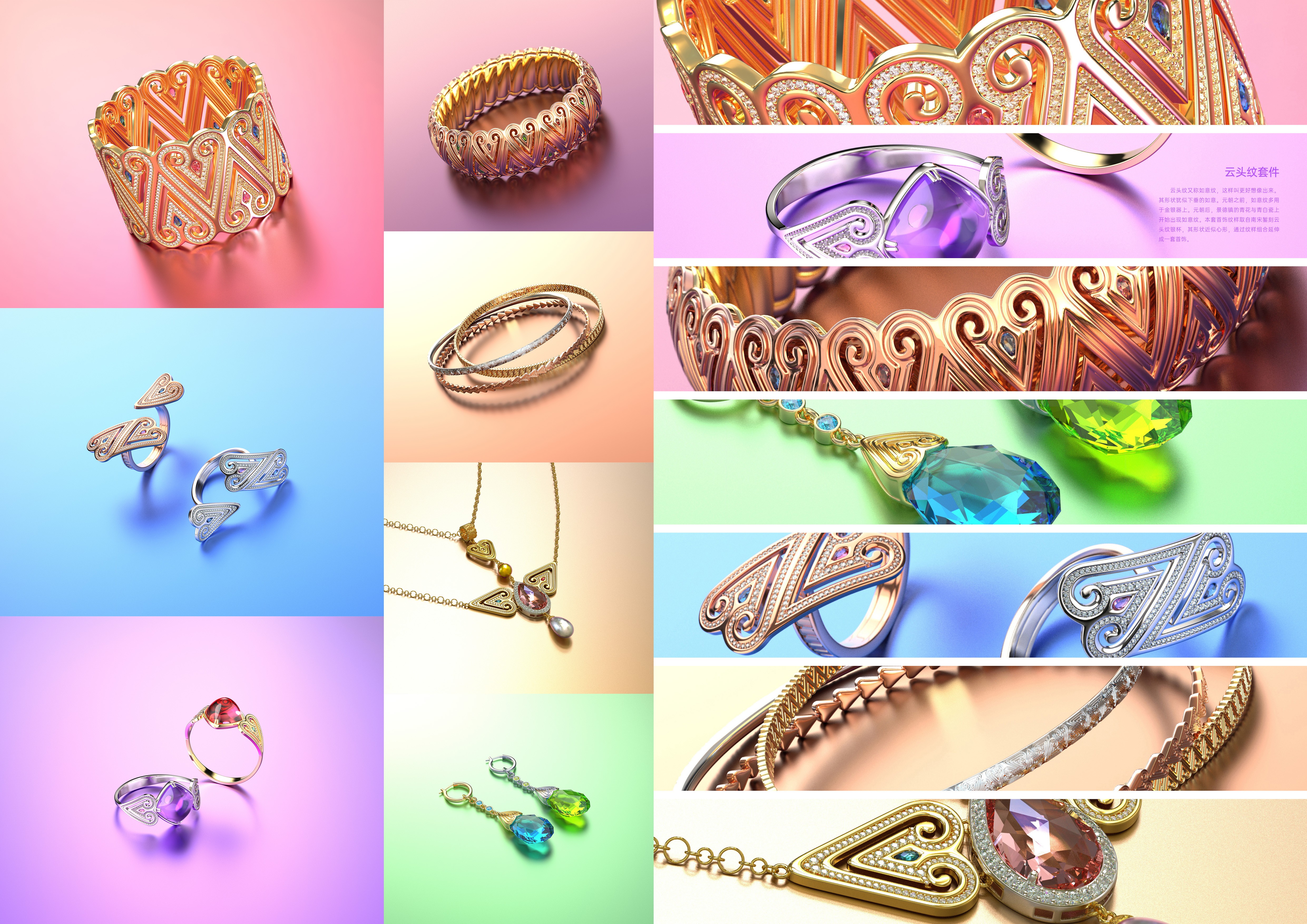 創(chuàng)作思路:云頭紋又稱如意紋,這樣叫更好想像出來。其形狀猶似下垂的如意。元朝之前,如意紋多用于金銀器上。元朝后,景德鎮(zhèn)的青花與青白瓷上開始出現(xiàn)如意紋。本套首飾紋樣取自南宋鏨刻云頭紋銀杯,其形狀近似心形,通過紋樣組合延伸成一套首飾。