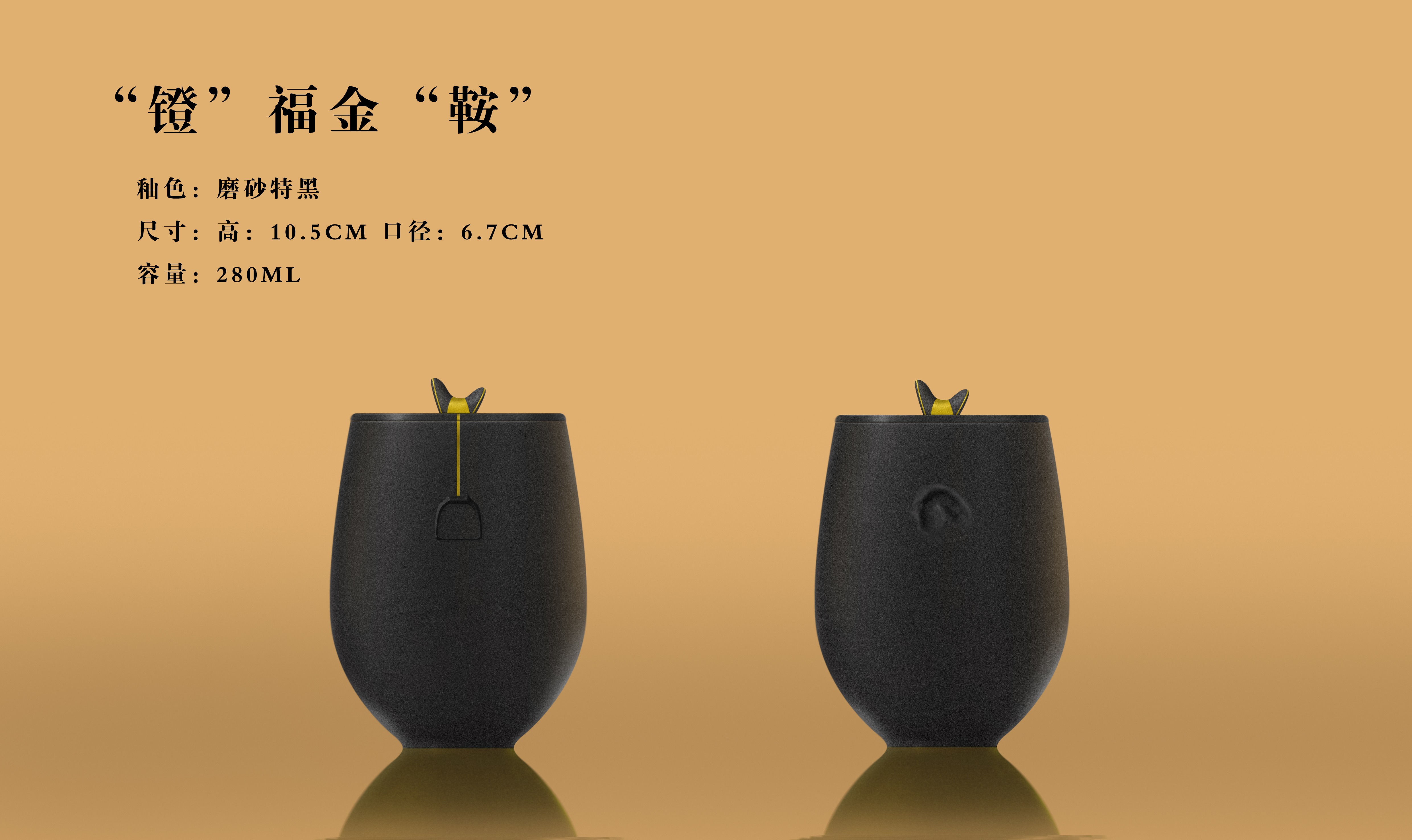 設(shè)計理念:將鄂爾多斯地區(qū)馬鞍造型作為設(shè)計主線,以簡潔現(xiàn)代的造型表現(xiàn)馬鞍,同時形似元寶。馬鐙與馬足跡在強(qiáng)調(diào)馬鞍的同時具備卡指功能,使用時更加穩(wěn)定。黑色磨砂釉搭配描金工藝,簡潔現(xiàn)代大氣?!扮嫛苯栌鳌暗恰?,”鞍“借喻“安”故 《萬福金安》