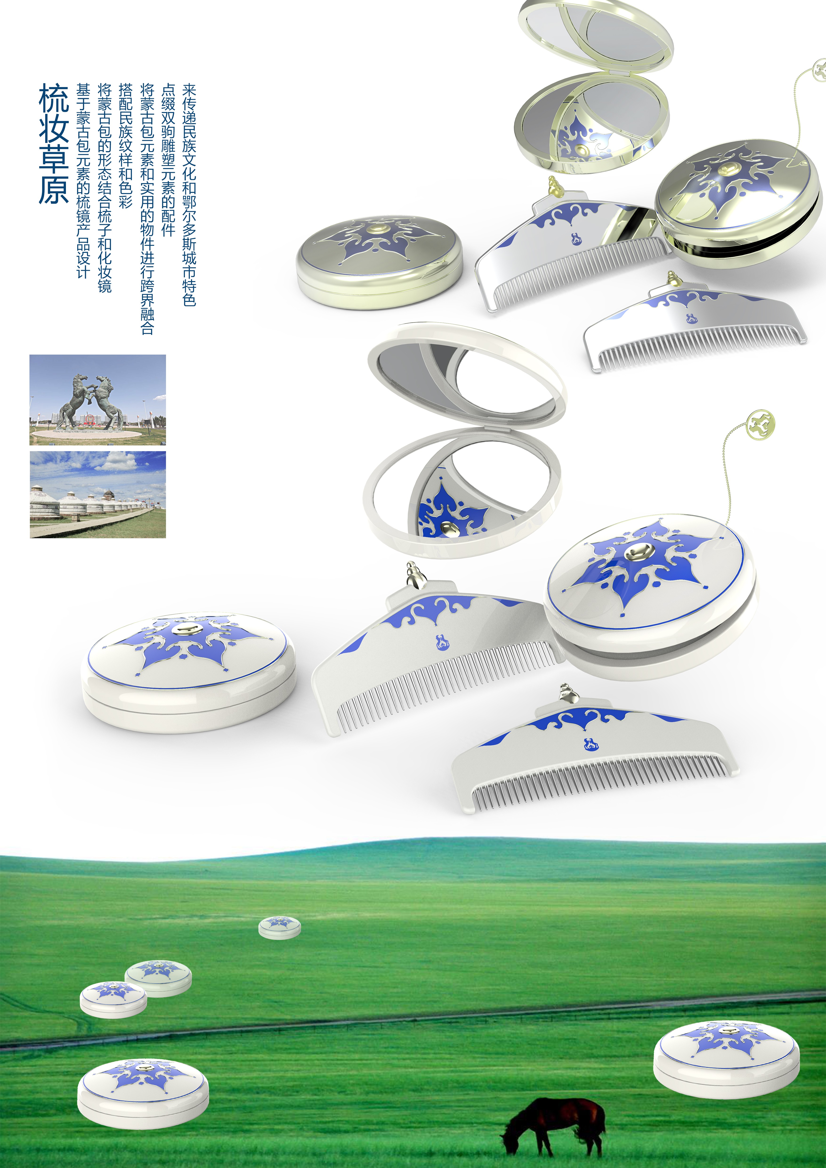 設(shè)計(jì)理念:此設(shè)計(jì)為組合設(shè)計(jì),把蒙古包的元素分別植入到梳子的翻蓋鏡子的功能中,用簡(jiǎn)潔大方的配色來(lái)傳遞出獨(dú)特的草原文化美感