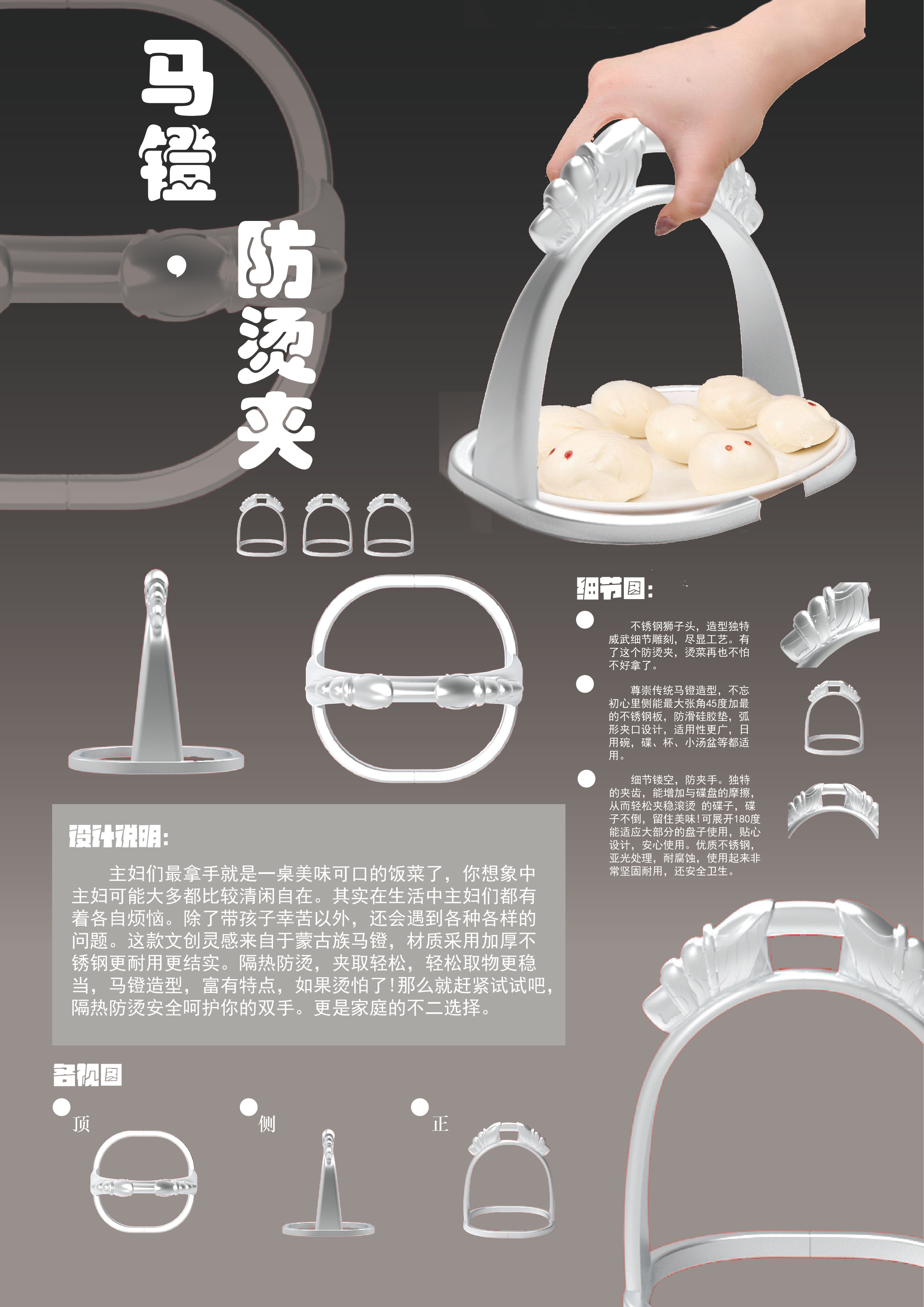 創(chuàng)作思路:這款文創(chuàng)靈感來自于蒙古族馬鐙,材質(zhì)采用加厚不銹鋼更耐用更結(jié)實。隔熱防燙,夾取輕松,輕松取物更穩(wěn)當(dāng),馬鐙造型,富有特點,如果燙怕了!那么就趕緊試試吧,隔熱防燙安全呵護(hù)你的雙手。更是家庭的不二選擇。