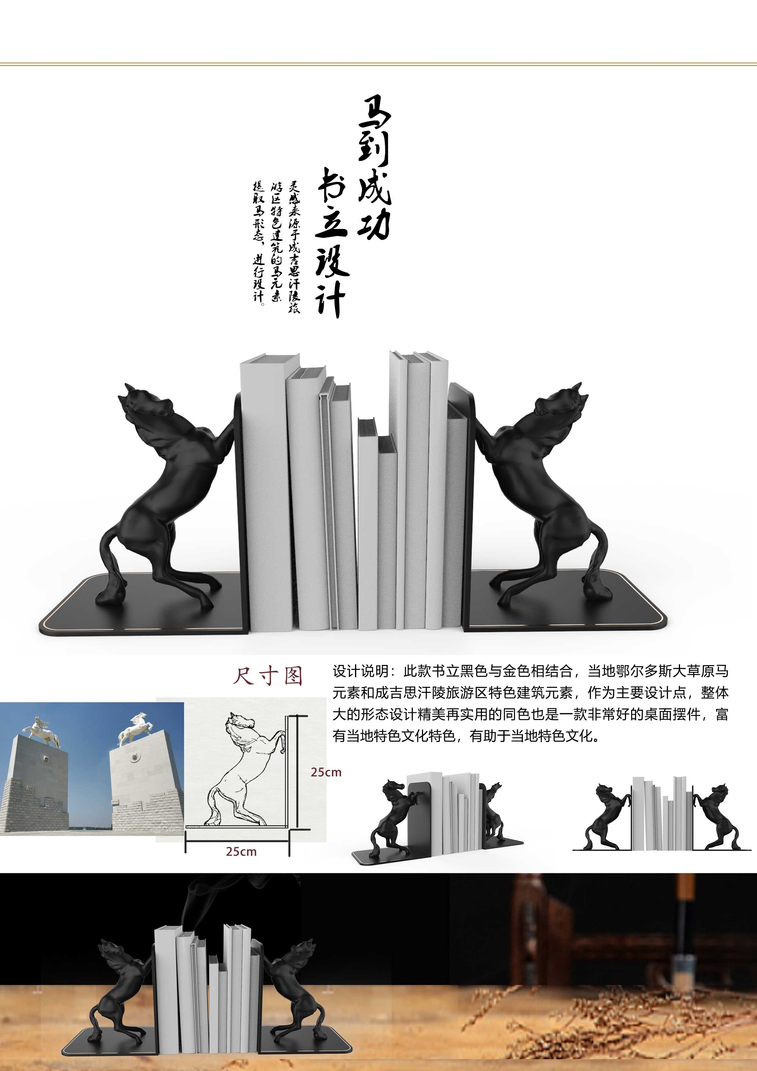 此款書立黑色與金色相結(jié)合,當(dāng)?shù)囟鯛柖嗨勾蟛菰R元素和成吉思汗陵旅游區(qū)特色建筑元素,作為主要設(shè)計(jì)點(diǎn),整體大的形態(tài)設(shè)計(jì)精美再實(shí)用的同色也是一款非常好的桌面擺件,富有當(dāng)?shù)靥厣幕厣?,有助于?dāng)?shù)靥厣幕?br />