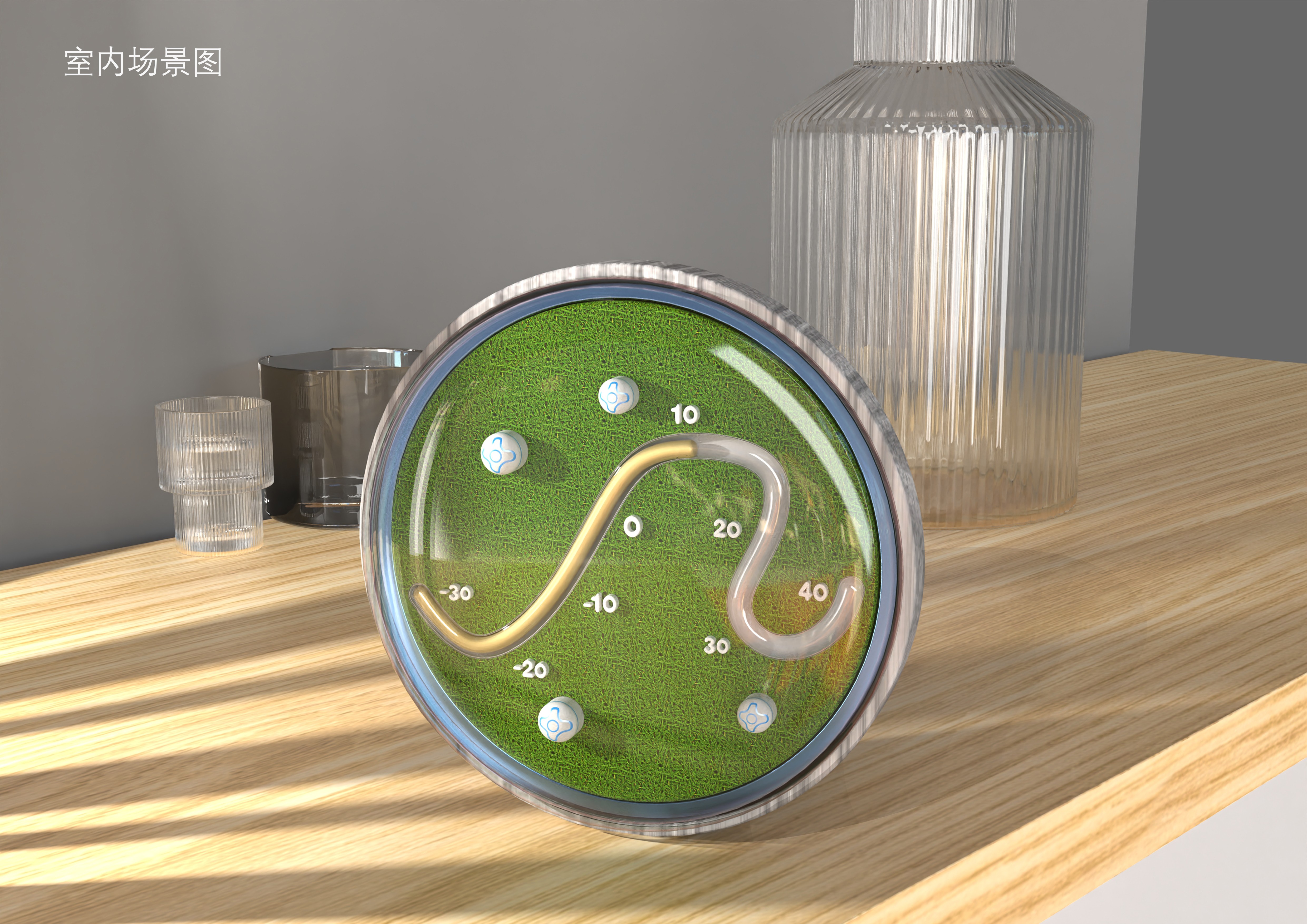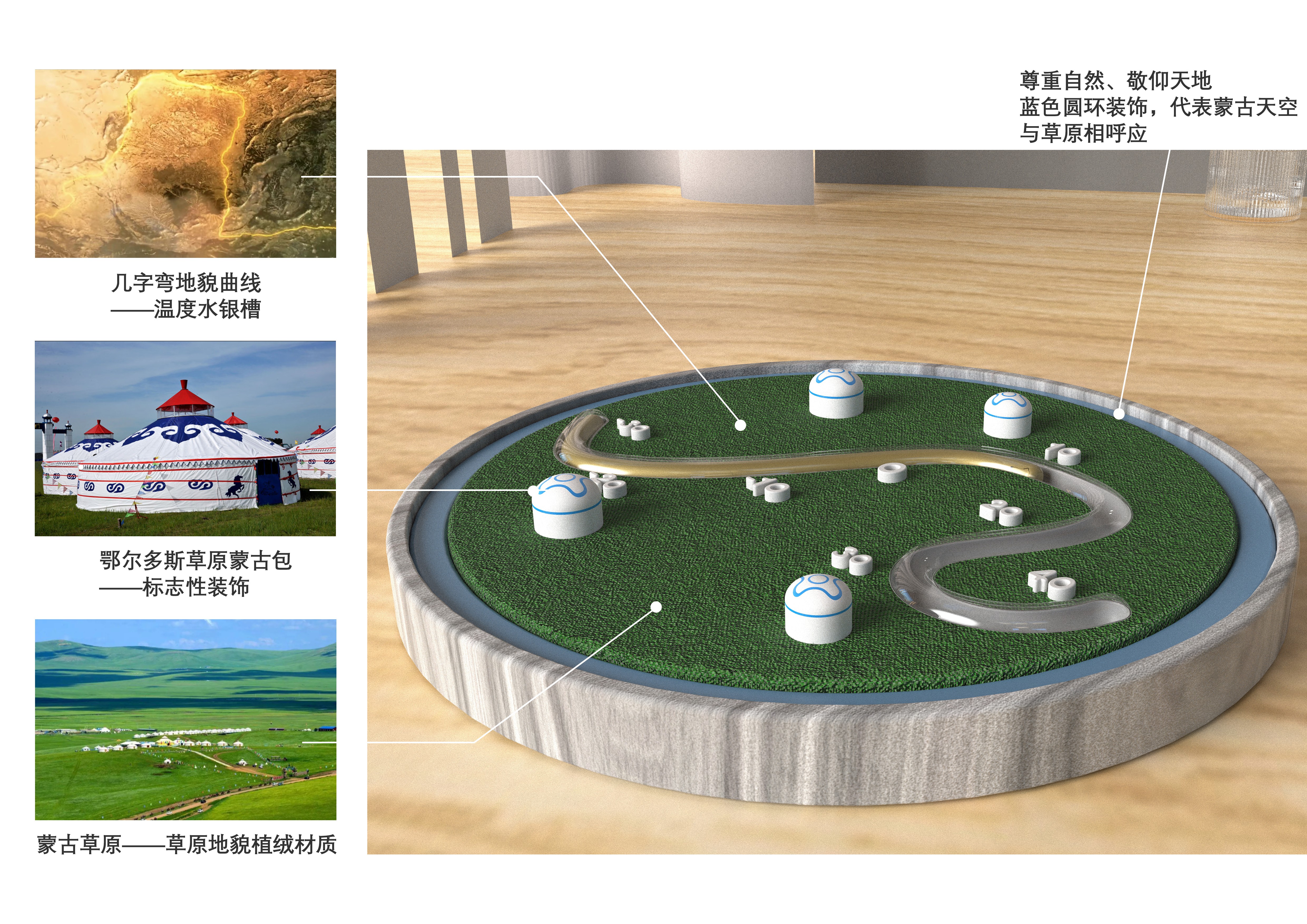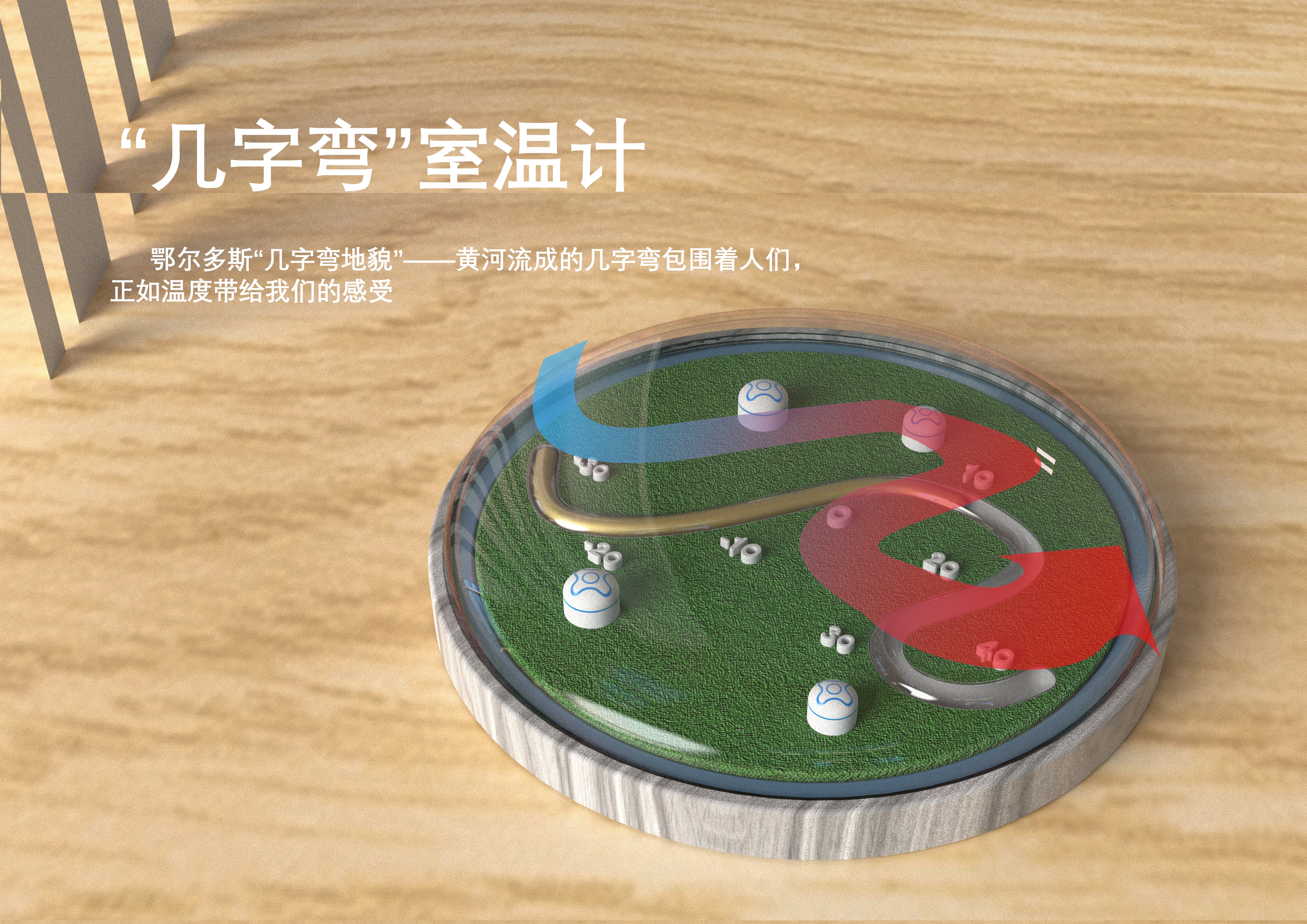 提取幾字彎的輪廓線條進(jìn)行簡(jiǎn)化概括,設(shè)計(jì)為室溫計(jì)的水銀槽,將水銀因?yàn)闇囟茸兓療崦浝淇s原理與黃河水流出的感覺(jué)進(jìn)行通感結(jié)合。周邊圍繞蒙古包與草原。整體造型還原了鄂爾多斯草原的俯視圖,仿佛將一個(gè)迷你的蒙古草原帶回家。