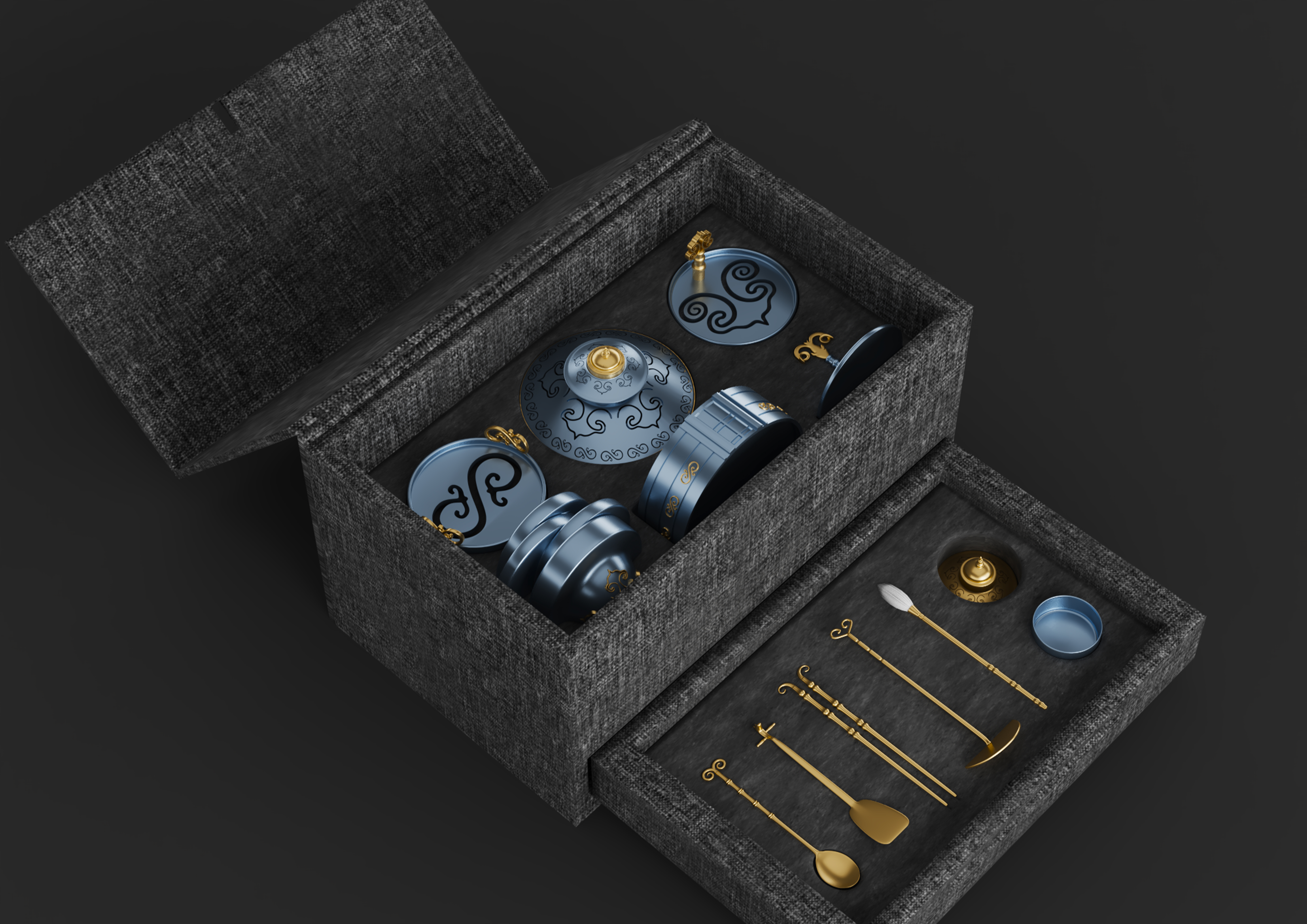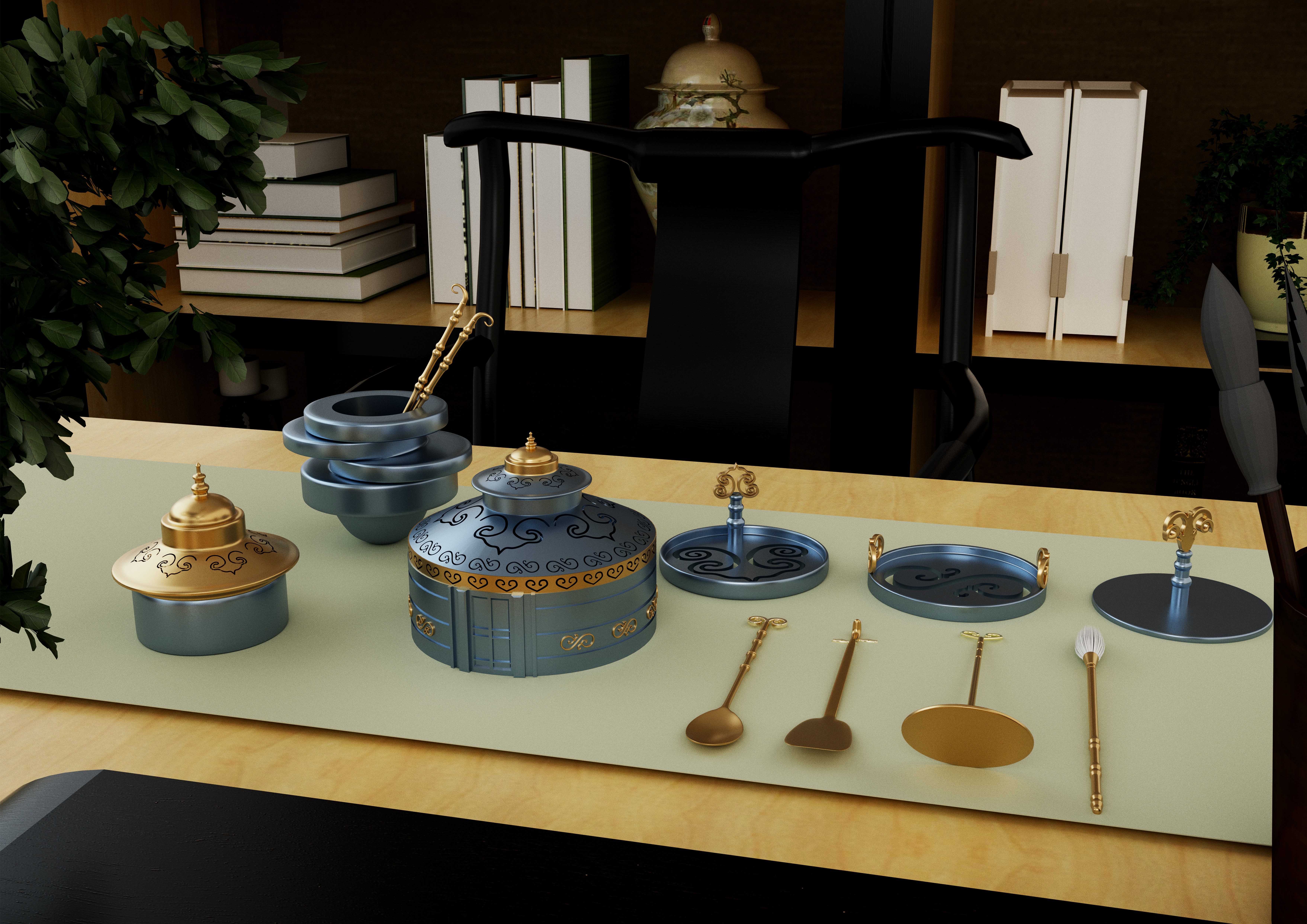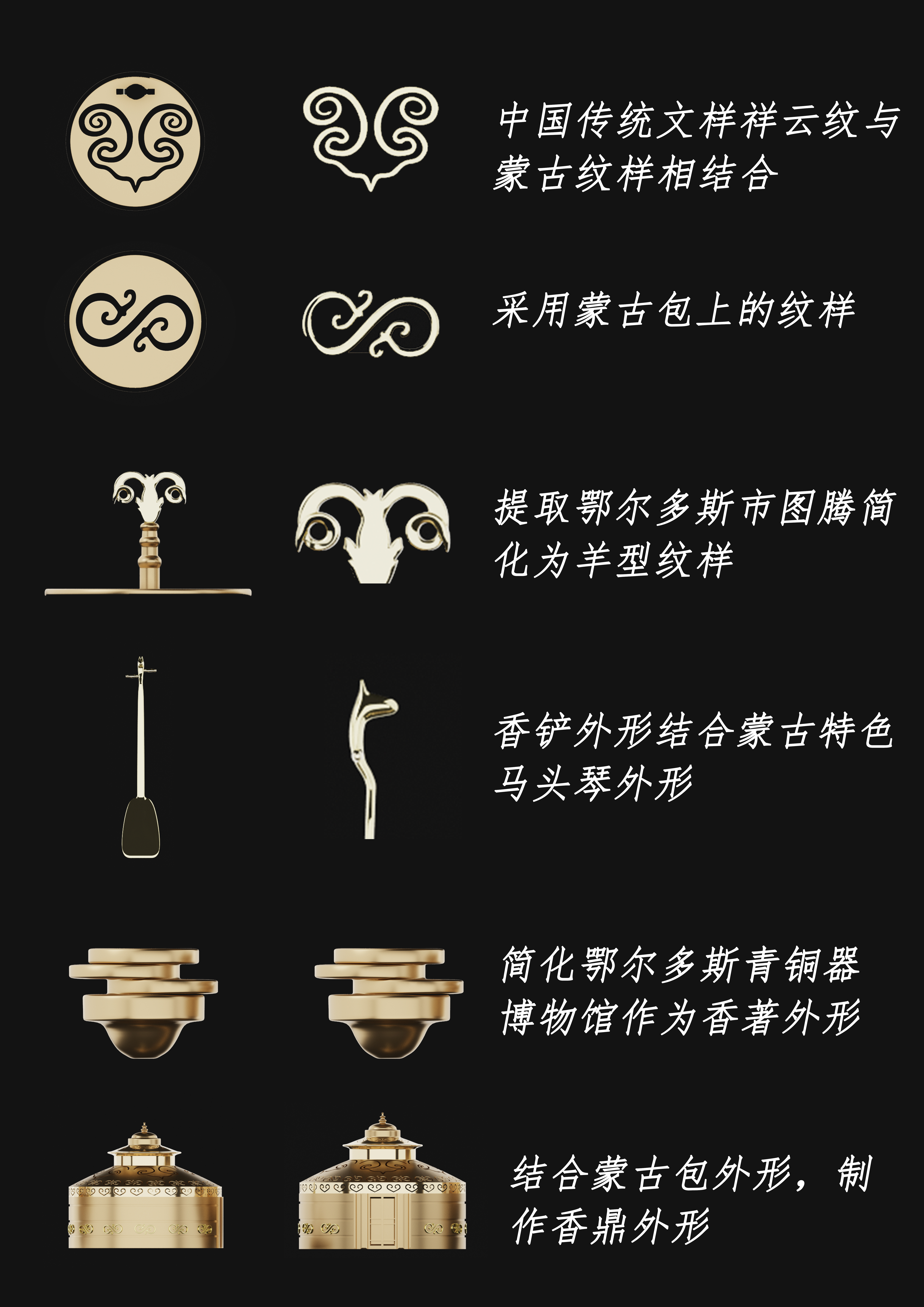 創(chuàng)作思路:將鄂爾多斯蒙古包與香爐相結(jié)合,創(chuàng)作穹廬香鼎,并以多種傳統(tǒng)文化衍生,創(chuàng)作香著香勺等物品,將蒙古傳統(tǒng)紋樣與中化傳統(tǒng)紋樣相結(jié)合,寓意吉祥福瑞